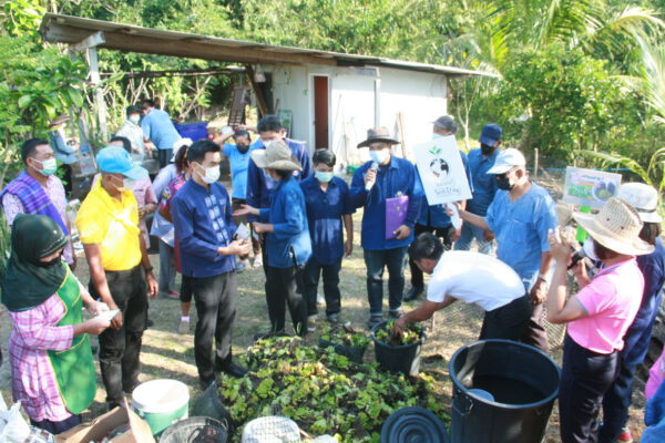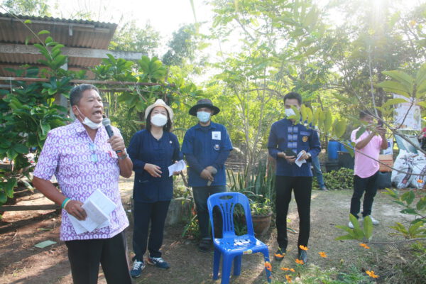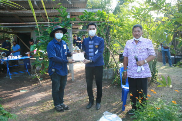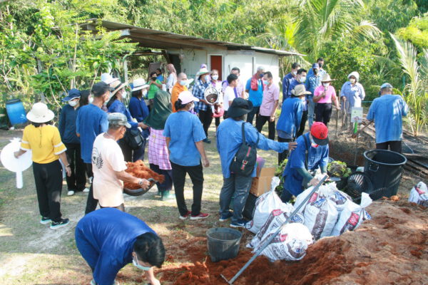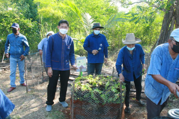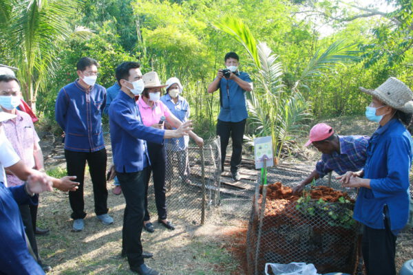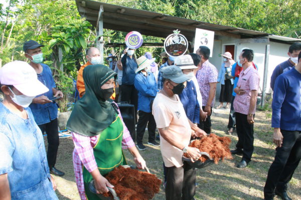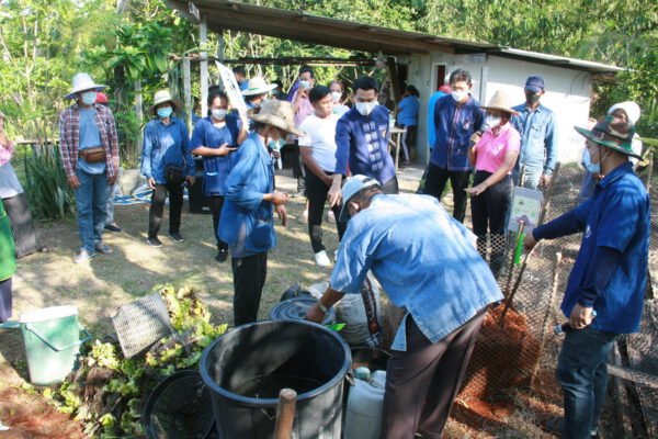 จากนั้น นายอำเภอ พร้อมผู้เข้าร่วมกิจกรรม ได้ชมสาธิตการทำปุ๋ยแห้งชีวภาพ โดยมีส่วนผสม ดังนี้ อินทรีย์วัตถุ เช่นใบไม้ หญ้า ฟาง 4 ส่วนมูลสัตว์หรือปุ๋ยคอก 1 ส่วน รำ น้ำสะอาด + ปุ๋ยน้ำ โดยวิธีทำ เทอินทรีย์วัตถุสลับมูลสัตว์หรือปุ๋ยคอก จนได้ความสูงกองประมาณ 90 ซม. รดน้ำบนกองปุ๋ยทุกวัน เจาะกองปุ๋ยโดยเอาไม้แทงลงไปในกอง เพื่อเติมอากาศและน้ำเพื่อช่วยในการย่อยสลายทุก ๆ 15 วัน เจาะจุดใหม่เติมน้ำและอากาศเพิ่ม ทำทั้งหมด 6 ครั้ง ประโยชน์ของปุ๋ย คือ ช่วยเพิ่มปริมาณอินทรีย์วัตถุให้แก่ดิน ทำให้ดินอุดมสมบูรณ์ ช่วยเปลี่ยนสภาพของดินจากดินเหนียวหรือดินทรายให้เป็นดินร่วนทำให้สะดวกในการไถพรวน ช่วยสงวนรักษาความชุ่มชื้นในดินได้ดีขึ้น ทำให้การถ่ายเทอากาศในดินได้ดี ช่วยเพิ่มประสิทธิภาพในการใช้ปุ๋ยเคมีและสามารถลดการใช้ปุ๋ยเคมีลงได้ ช่วยกระตุ้นให้ธาตุอาหารพืชบางอย่างในดินที่ละลายน้ำยากให้ละลายน้ำง่ายเป็นอาหารแก่พืชได้ดีขึ้น ไม่เป็นอันตรายต่อดินแม้จะใช้ในปริมาณมาก ๆ ติดต่อกันนาน ๆ ช่วยปรับสภาพแวดล้อม เช่น กำจัดขยะมูลฝอยและวัชพืชน้ำทั้งหลายให้หมดไป