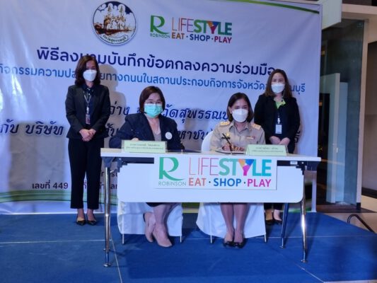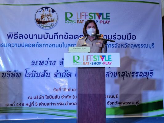 ซึ่งมี นางสาวสุกัลยา แก้วสม สวัสดิการและคุ้มครองแรงงานจังหวัดสุพรรณบุรี และนางสาวจงกลนี ไชยองค์การ ผู้จัดการทั่วไปศูนย์การค้าโรบินสัน สาขาสุพรรณบุรี ร่วมลงนาม ณ ศูนย์การค้าโรบินสัน สาขาสุพรรณบุรี ชั้น 2 บริเวณหน้าโรงภาพยนตร์ เอส เอฟ ซีนีม่า เพื่อช่วยลดความสูญเสียจากการเกิดอุบัติเหตุทางถนน ร่วมกันสร้างวัฒนธรรมความปลอดภัยทางถนน และปลูกจิตสำนึกรักษาความปลอดภัยให้แก่พนักงานอย่างเป็นรูปธรรมและยั่งยืน