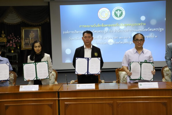 วันที่ 16 กุมภาพันธ์ 2566 ที่ห้องประชุมองค์การบริหารส่วนจังหวัดนครปฐม นายจิรวัฒน์ สะสมทรัพย์ นายกองค์การบริหารส่วนจังหวัดนครปฐม และนางสาวปทุมมาศ กมลเวช รองปลัดองค์การบริหารส่วนจังหวัดนครปฐม รักษาราชการแทนปลัดองค์การบริหารส่วนจังหวัดนครปฐม ลงนามบันทึกข้อตกลงการรับเงินอุดหนุนจากองค์การบริหารส่วนจังหวัดนครปฐม กับสำนักงานสาธารณสุขจังหวัดนครปฐม โดย นพ.วิโรจน์ รัตนอมรสกุล นายแพทย์สาธารณสุขจังหวัดนครปฐม นพ.นเรศ มณีเทศ ผู้อำนวยการโรงพยาบาลนครชัยศรี นางอัญชลี ป้อมปราณี พยาบาลวิชาชีพชำนาญการ รักษาการในตำแหน่งหัวหน้ากลุ่มงานการพยาบาลโรงพยาบาลนครชัยศรี และนางดรุณี โพธิ์ศรี นักวิชาการสำนักงานสาธารณสุขชำนาญการพิเศษ หัวหน้ากลุ่มงานควบคุมโรค จังหวัด นางน้ำฝน โพธิ์สุพรรณพงศ์ นักวิชาการสาธารณสุขเชี่ยวชาญ (ด้านบริการทางวิชาการชำนาญการ) งบประมาณรวม 9,902,000บาท เพื่อนำไปใช้ในด้านการสาธารณสุขทั้งสิ้น 3โครงการ