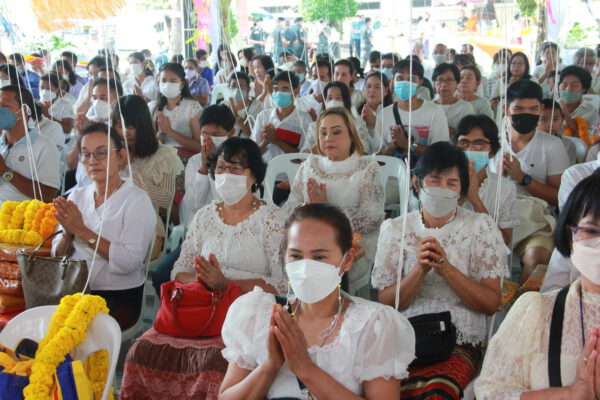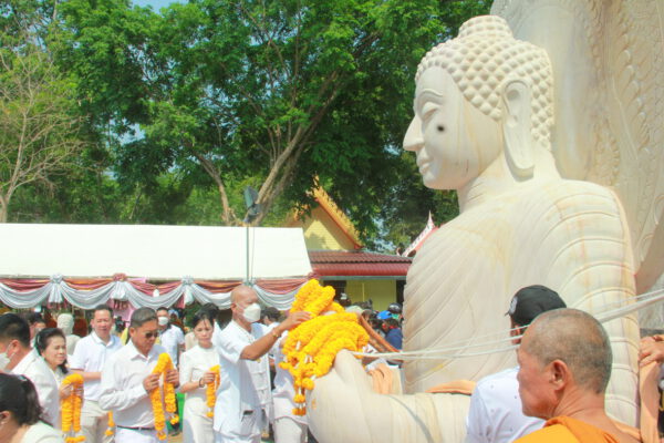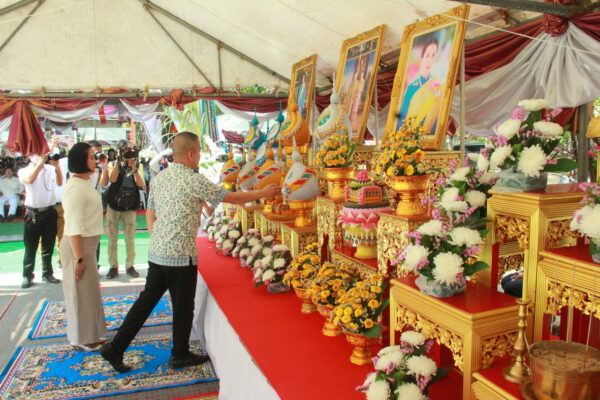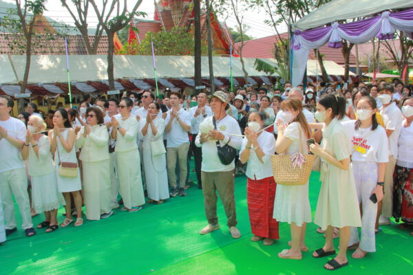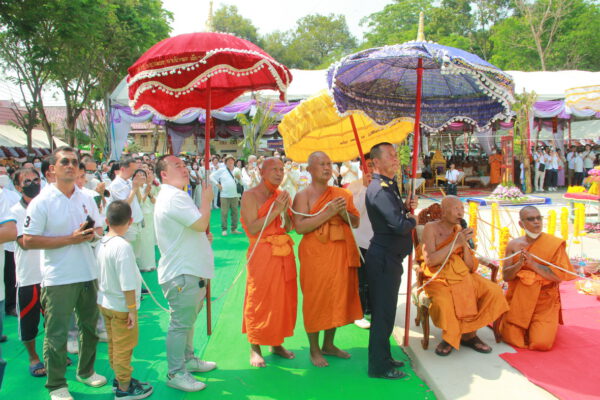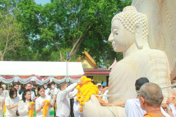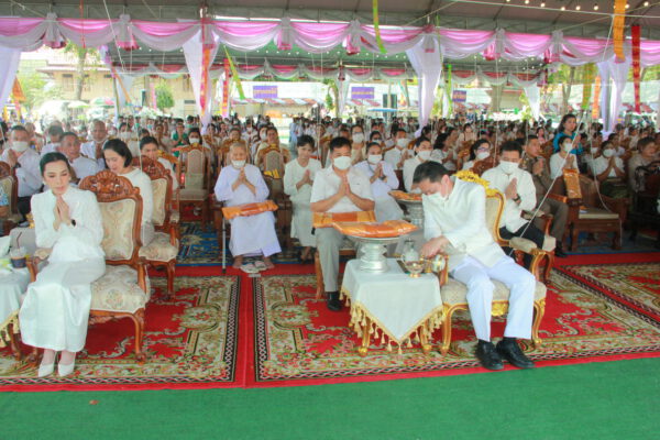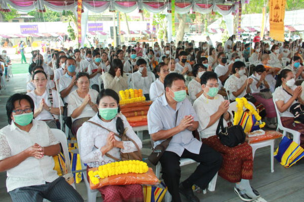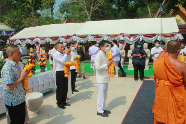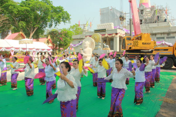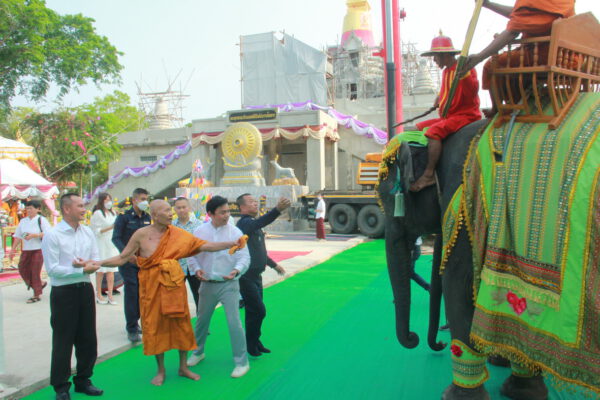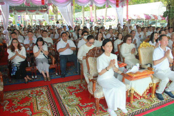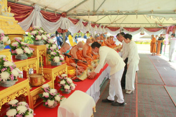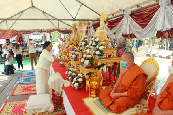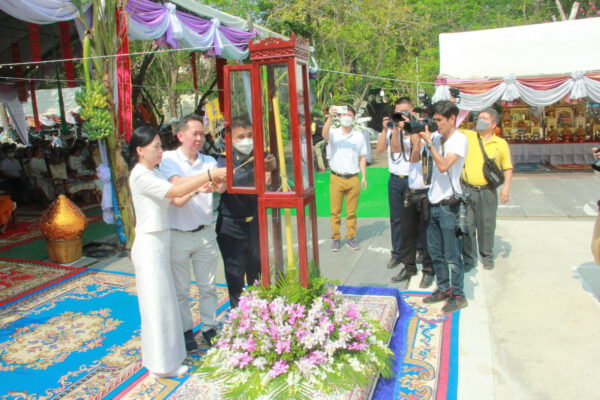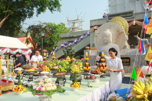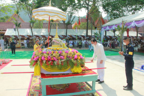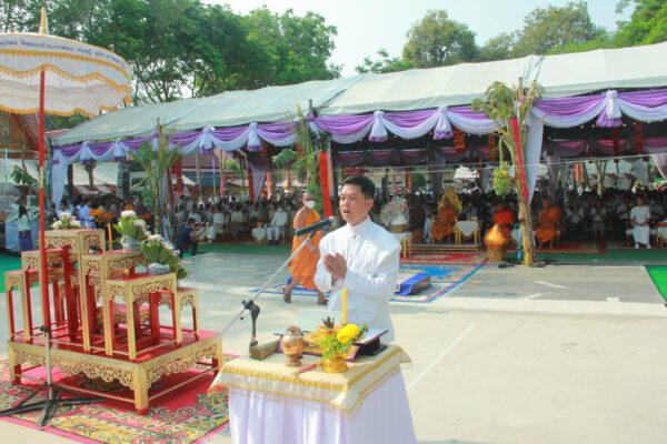 จากนั้น นายอภิพันธ์ เจริญอนุสรณ์ ประธานเจ้าหน้าที่บริหาร และกรรมการผู้จัดการบริษัท ออโต้เอกซ์ จำกัด และ นางพิกุล ศรีมหันต์ รองผู้จัดการใหญ่อาวุโส ประธานเจ้าหน้าที่บริหารกลุ่มธุรกิจ SME ธนาคารไทยพาณิชย์ จำกัด (มหาชน) ร่วมเป็นประธานจุดเทียนชัยบูชาพระบรมสารีริกธาตุ ก่อนพิธีกรนำบูชาพระรัตนตรัย และพิธีแสดงตนเป็นพุทธมามกะ นำโดย พระเทพสิทธิวิมล เจ้าคณะภาค 15 อาราธนาศีล และพระปริตร และพิธีอัญเชิญพระประดิษฐาน ณ ฐานดอกบัว และพิธีถวายพวงมาลัยดาวเรือง นำโดย พระเทพสิทธิวิมล และคณะสงฆ์ ผู้ว่าราชการจังหวัด รองผู้ว่าราชการจังหวัด หัวหน้าส่วนราชการ ข้าราชการ องค์กรปกครองส่วนท้องถิ่น และพุทธศาสนิกชน โดยนำอธิษฐานจิต และนำแผ่นทองบรรจุในฐานบัว