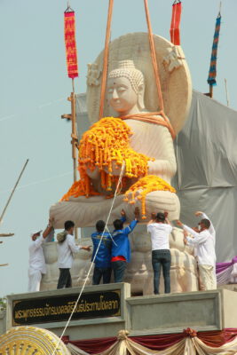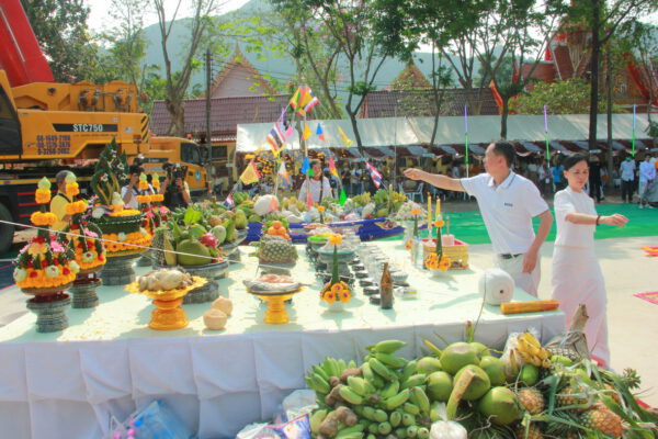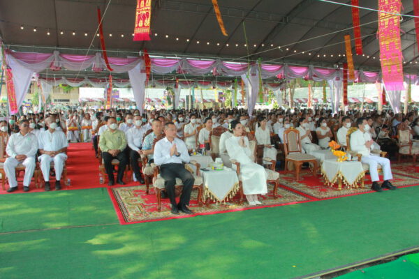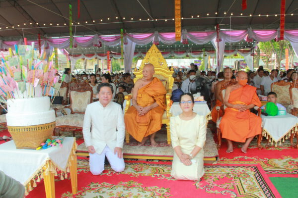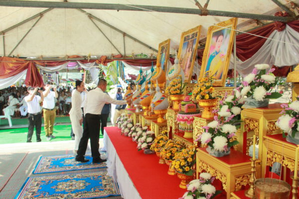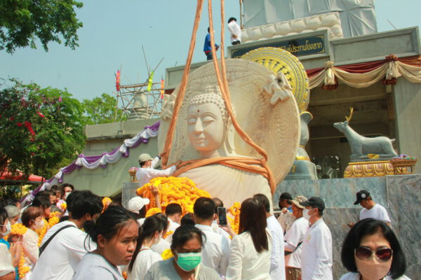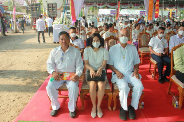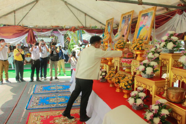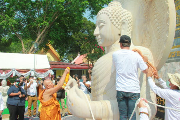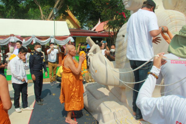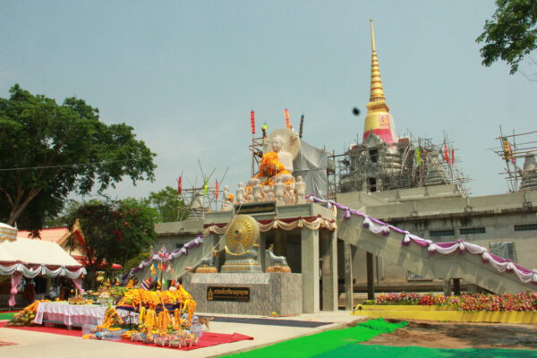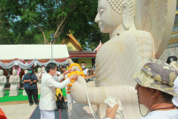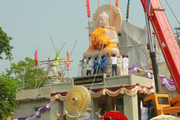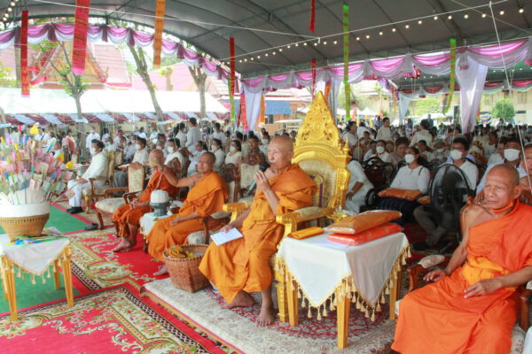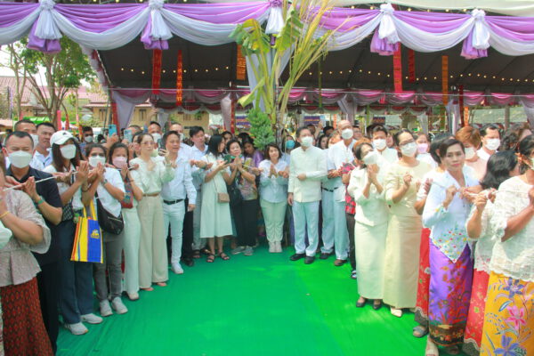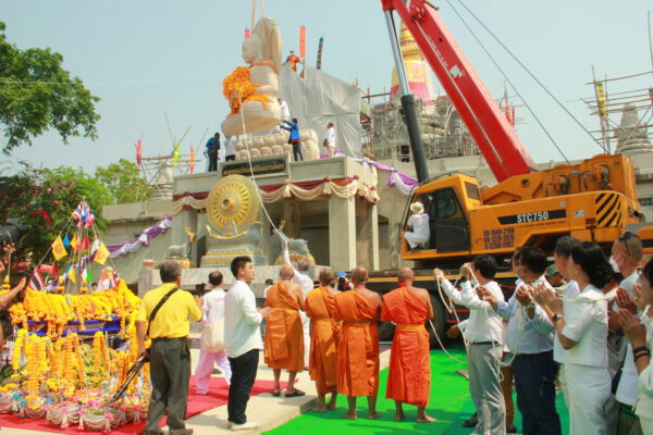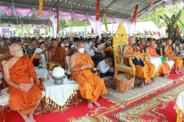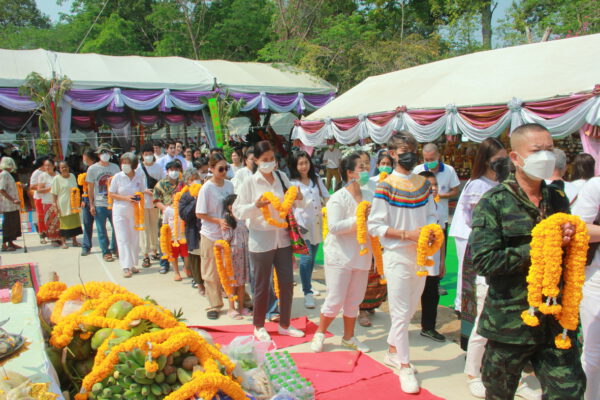 จากนั้น นายอภิพันธ์ เจริญอนุสรณ์ ประธานเจ้าหน้าที่บริหาร และกรรมการผู้จัดการบริษัท ออโต้เอกซ์ จำกัด และ นางพิกุล ศรีมหันต์ รองผู้จัดการใหญ่อาวุโส ประธานเจ้าหน้าที่บริหารกลุ่มธุรกิจ SME ธนาคารไทยพาณิชย์ จำกัด (มหาชน) ร่วมเป็นประธานจุดเทียนชัยบูชาพระบรมสารีริกธาตุ ก่อนพิธีกรนำบูชาพระรัตนตรัย และพิธีแสดงตนเป็นพุทธมามกะ นำโดย พระเทพสิทธิวิมล เจ้าคณะภาค 15 อาราธนาศีล และพระปริตร และพิธีอัญเชิญพระประดิษฐาน ณ ฐานดอกบัว และพิธีถวายพวงมาลัยดาวเรือง นำโดย พระเทพสิทธิวิมล และคณะสงฆ์ ผู้ว่าราชการจังหวัด รองผู้ว่าราชการจังหวัด หัวหน้าส่วนราชการ ข้าราชการ องค์กรปกครองส่วนท้องถิ่น และพุทธศาสนิกชน โดยนำอธิษฐานจิต และนำแผ่นทองบรรจุในฐานบัว