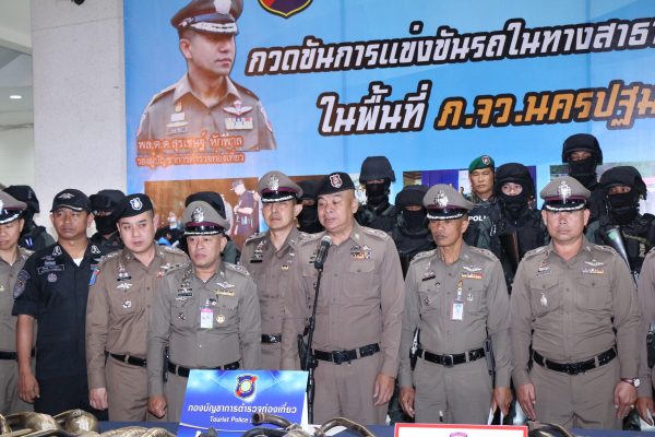 วันที่ 11 สิงหาคม 2561 เมื่อเวลา 01.45 น.วันที่ 11 สิงหาคม ที่ลานหน้าอาคารกองบัญชาการตำรวจภูธรภาค 7 และ ลานฝึกวงศ์บูรณ์ ศูนย์ฝึกตำรวจภูธร 7 อำเภอเมืองจังหวัดนครปฐม พลตำรวจตรีคำรณ บุญเลิศ ผู้บังคับการตำรวจภูธร จังหวัดนครปฐม พันตำรวจเอก พงศ์ศักดิ์ ชูนาค รองผู้บังคับการ ตำรวจภูธรจังหวัดนครปฐม พันตำรวจเอก ชัชปัณฑกาณฑ์ คล้ายคลึง รองผู้บังคับการ ตำรวจภูธรจังหวัดนครปฐม พันตำรวจเอก นิติธร จินตกานนท์ รองผู้บังคับการ สปพ. พันตำรวจเอกธีรเดช ธรรมสุธีร์ รองผู้บังคับการอำนวยการ บช.ปส. พ้นตำรวจเอก คณิต กลิ่นศรีสุข ผู้กำกับการ กองกำกับการต่อต้านการก่อการร้าย บก.สปพ. พันตำรวจเอกฉัตรชัย สำเนียงผู้กำกับ 5 บก.จร. พันตำรวจเอกสุทธิพงษ์ พุฒิพงศ์ผู้กำกับ ศร.บก.สปพ. พันตำรวจเอกไพบูลย์ แพรสีนวล ผู้กำกับการสืบสวน ตำรวจภูธรจังหวัดนครปฐม พันตำรวจเอกชัยรินทร์ แก้วสุวรรณ ผู้กำกับการสถานีตำรวจ ภูธรโพธิ์แก้ว พันตำรวจเอก สีหเดช สระกอบแก้ว ผู้กำกับการสถานีตำรวจ ภูธรนครชัยศรี พันตำรวจเอกไพฑูรย์ พิทักษ์ธรรม ผู้กำกับการสถานีตำรวจภูธร เมืองนครปฐม พันตำรวจเอกศุภเกียรติ เทิดตระกูล ผู้กำกับการสถานีตำรวจภูธรกำแพงแสน พันตำรวจเอกสุรชัย สุกใส ผู้กำกับการสถานีตำรวจ ภูธรโพรงมะเดื่อ พันตำรวจเอกประเสริฐ กัลยาวุฒิพงศ์ ผู้กำกับการสถานีตำรวจ ภูธรดอนตูม พันตำรวจเอกวชิระ ลภเลิศ ผู้กำกับการสถานีตำรวจ ภูธรบางเลน พันตำรวจเอกทวี พรมมาลี ผู้กำกับการสถานีตำรวจ ภูธรพุทธมณฑล พันตำรวจเอกพงษกร อุปพงษ์ ผู้กำกับการสถานีตำรวจ ภูธรสามพราน พร้อมกำลังเจ้าหน้าที่ตำรวจในสังกัดของ แต่ละหน่วย จากกองบัญชาการตำรวจท่องเที่ยวกองบัญชาการตำรวจปราบปรามยาเสพติดกองบังคับการตำรวจภูธรจังหวัดนครปฐมกองบังคับการสายตรวจและปฏิบัติการพิเศษ ได้ร่วมกันนำผลการปฏิบัติ การปราบปรามการแข่งรถในทางสาธารณะในพื้นที่จังหวัดนครปฐม มา io แถลงผลงานต่อสื่อมวลชน หนึ่งในผลการปฏิบัติ