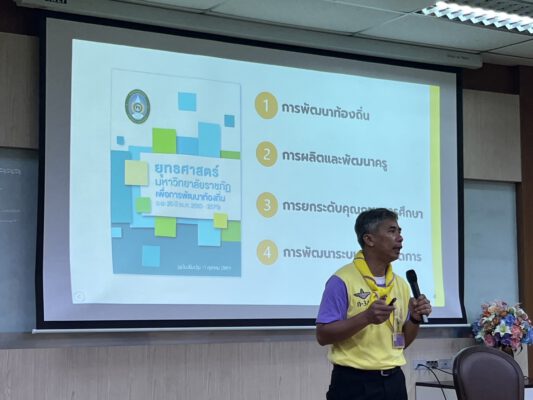 ดร.วิรัตน์ ได้กล่าวต้อนรับกลุ่มจิตอาสาฯ และกล่าวถึงยุทธศาสตร์มหาวิทยาลัยราชภัฏเพื่อการพัฒนาท้องถิ่น ได้แก่ 1) การพัฒนาท้องถิ่น 2) การผลิตและพัฒนาครู 3) การยกระดับคุณภาพการศึกษา และ 4) การพัฒนาระบบบริหารจัดการ และบรรยายหัวข้อ“การขยายผลศูนย์การเรียนรู้เศรษฐกิจพอเพียง” มหาวิทยาลัย ราชภัฏนครปฐม โดยฉายภาพจุดเริ่มต้นของการจัดตั้งศูนย์การเรียนรู้เศรษฐกิจพอเพียง และแนวทางการพัฒนาสู่การเป็นรูปธรรมและยั่งยืน