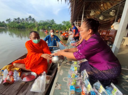 วันนี้ (21 พ.ค.66) เวลา 07.00 น. ที่ศูนย์อนุรักษ์พันธุ์กล้วยสุพรรณบุรี ด้านหลังวัดป่าเลไลยก์วรวิหาร อำเภอเมือง จังหวัดสุพรรณบุรี พ.อ.ผ่านศึก อนันตพงษ์ รอง ผอ.รมน.จังหวัดสุพรรณบุรี พร้อมด้วย เจ้าหน้าที่ในสังกัดสำนักนายกรัฐมนตรี ตลอดจน ส่วนราชการ ประชาชนและนักท่องเที่ยวแต่งกายด้วยชุดผ้าไทย ร่วมกิจกรรมตักบาตรทางน้ำนาวาภิกขาจารใส่บาตรพระสงฆ์ จำนวน 9 รูป เพื่ออนุรักษ์ฟื้นฟูประเพณีตักบาตรทางน้ำของวัดป่าเลไลยก์วรวิหาร ที่สมัยก่อนบ้านและวัดมักอยู่ติดริมแม่น้ำ พระสงฆ์ออกรับบิณฑบาตทางเรือ ซึ่งปัจจุบันหาชมได้ยาก เนื่องจากเส้นทางคมนาคมสะดวกสบายกว่าแต่ก่อน ทำให้ประเพณีการตักบาตรทางน้ำนับวันยิ่งสูญหายไป