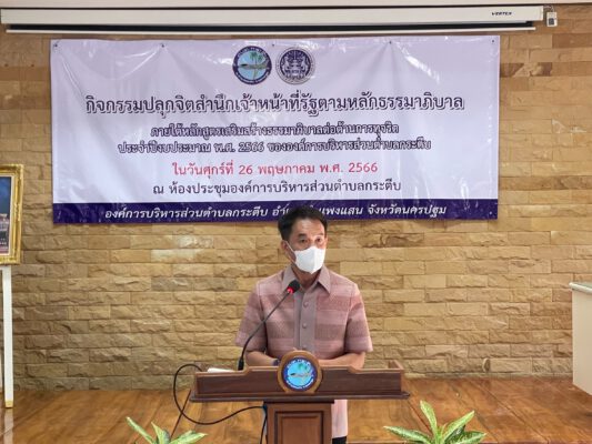 วันที่ 26 พฤษภาคม 2566 ที่ห้องประชุมองค์การบริหารส่วนตำบลกระตีบ อำเภอกำแพงแสน จังหวัดนครปฐม นายยงยุทธ สวนทอง รองผู้ว่าราชการจังหวัดนครปฐมเป็นประธานเปิดโครงการอบรมปลุกจิตสำนึกเจ้าหน้าที่รัฐตามหลักธรรมาภิบาล ภายใต้หลักสูตรเสริมสร้างธรรมาภิบาล ต่อต้านการทุจริตประจำปี 2566 โดยมี ผู้บัญชาการโรงเรียนการบิน นายอำเภอกำแพงแสน ผู้บริหารองค์กรปกครองส่วนท้องถิ่น ผู้บริหารสถานศึกษา ส่วนราชการ และเจ้าหน้าที่ ร่วมโครงการในครั้งนี้