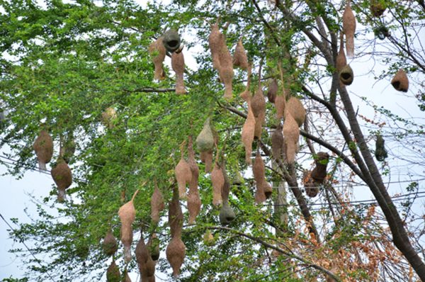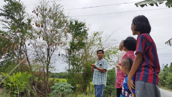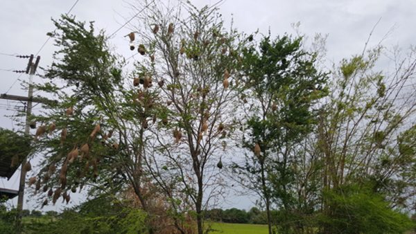 จึงไปตรวจสอบพบชาวบ้านจำนวนหนึ่งกำลังยืนดูฝูงนกจำนวนมากที่คาบใบหญ้าบินมาทำรังอยู่บนต้นมะขามเทศขนาดใหญ่สูงประมาณ 10 เมตรและส่งเสียงเจื้อยแจ้วด้วยความสนใจ
