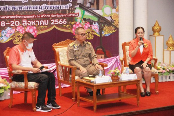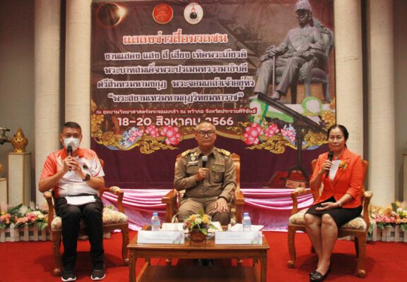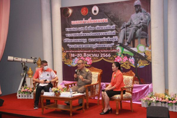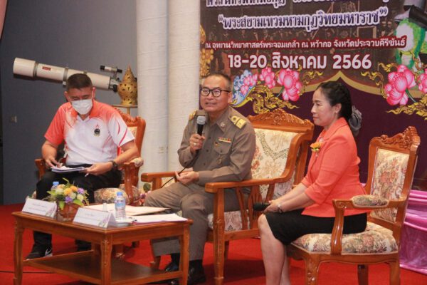 เมื่อเวลา 13.00 น. วันที่ 17 ก.ค.2566 ว่าที่พันตรี อดิศักดิ์ น้อยสุวรรณ รองผู้ว่าราชการจังหวัดประจวบคีรีขันธ์ รักษาราชการแทน ผู้ว่าราชการจังหวัดประจวบฯ เป็นประธานการแถลงข่าว การจัดงานแสดงแสง สี เสียง เทิดพระเกียรติพระบาทสมเด็จพระปรเมนทรรามาธิบดีศรีสินทรมหามงกุฎ พระจอมเกล้าเจ้าอยู่หัว “พระสยามเทวมหามกุฏวิทยมหาราช” และงานสัปดาห์วิทยาศาสตร์แห่งชาติ ประจำปี 2566 โดยมี นางวนิดา พิมอุบล รองผู้อำนวยการอุทยานวิทยาศาสตร์พระจอมเกล้า ณ หว้ากอ ( อวจ.) รักษาการ ผู้อำนวยการฯ ร่วมแถลงข่าว และมี นางกฤษณา แผ่แสงจันทร์ วัฒนธรรมจังหวัด นายนพดล สรวงประดิษฐ์ พลังงานจังหวัด พ.ต.อ.ไพทูล พรมเขียน ผกก.สภ.เมืองประจวบฯ น.อ.สมเกียรติ เกาะคู ประจำกองบิน 5 / ผู้แทน ผบ.กองบิน 5 นางศรีสุลักษณ์ เจียมเจิม ที่ปรึกษานายกเทศมนตรีตำบลคลองวาฬ นางประภัยทอง ปี่แก้ว รองนายก อบต.คลองวาฬ ผู้แทนส่วนราชการ-หน่วยงาน องค์กรปกครองส่วนท้องถิ่น ผู้นำชุมชน ครูและนักเรียนจากสถานศึกษาต่างๆ ตลอดจนประชาชนในพื้นที่ เข้าร่วม ณ ห้องนวลจันทร์ อาคารพิพิธภัณฑ์สัตว์น้ำหว้ากอ อุทยานวิทยาศาสตร์พระจอมเกล้า ณ หว้ากอ บ้านหว้ากอ ต.คลองวาฬ อ.เมือง จ.ประจวบคีรีขันธ์