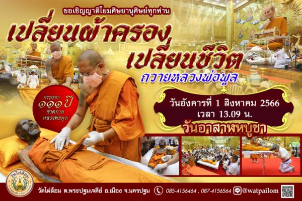 ในปีนี้เป็นวาระพิเศษ 111 ปีชาตกาลพระเดชพระคุณหลวงพ่อพูล 11 พฤศจิกายน 2455 – 11 พฤศจิกายน 2566 ในการเปลี่ยนผ้าครองสรีระสังขารพระเดชพระคุณหลวงพ่อพูลก็จะมีของที่ระลึก เป็นชิ้นส่วนจีวรของพระเดชพระคุณหลวงพ่อพูล เพื่อให้ศิษยานุศิษย์เก็บไว้บูชาเป็นสิริมงคล เป็นเครื่องยึดเหนี่ยวจิตใจด้วย การได้ร่วมบุญเปลี่ยนผ้าครองถวายหลวงพ่อพูลนั้น ถือเป็นการบูชาผู้มีพระคุณประการหนึ่ง จึงมีอานิสงส์มาก อาจเปลี่ยนชีวิตของคนให้ไปในทางที่ดีได้ เจริญขึ้นได้ อาตมาจึงขอเจริญพรประชาสัมพันธ์พิธีดังกล่าวนี้แก่สาธุชนทั้งหลายผู้มีจิตศรัทธา โดยสามารถมาร่วมงานได้ที่วิหารหลวงพ่อพูล วัดไผ่ล้อม จังหวัดนครปฐม ในวันที่ 1 สิงหาคม 2566 เวลา 13.09 น. ขอเจริญพร