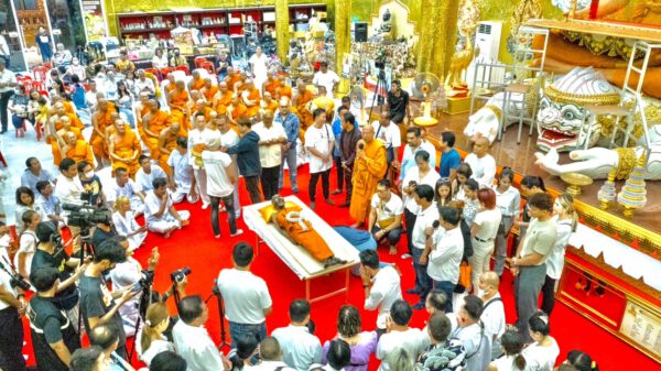 วันนี้ 1 สิงหาคม 66 ที่ศาลาหลวงพ่อพูล วัดไผ่ล้อม ต.พระปฐมเจดีย์ อ.เมือง จ.นครปฐมเวลา 16.09 น. พระครูปลัดสิทธิวัฒน์ หลวงพี่น้ำฝน เจ้าอาวาสวัดไผ่ล้อม นำคณะสงฆ์จัดพิธีเปลี่ยนผ้าครอง พระมงคลสิทธิการ หลวงพ่อพูล อัตตรักโข เกจิเถราจารย์ เนื่องในวันอาสาฬหบูชา ประจำปี 2566 โดยมีศิษยานุศิษย์พุทธศาสนิกชน ได้เข้ามาร่วมทำบุญเนื่องในวันสำคัญทางพรพะพุทธศาสนาและมาขอพรมงคลจากหลวงพ่อพูลและหลวงพี่น้ำฝน ซึ่งบรรยากาศมีผู้เข้ามาร่วมงานแน่นศาลาหลวงพ่อพูล