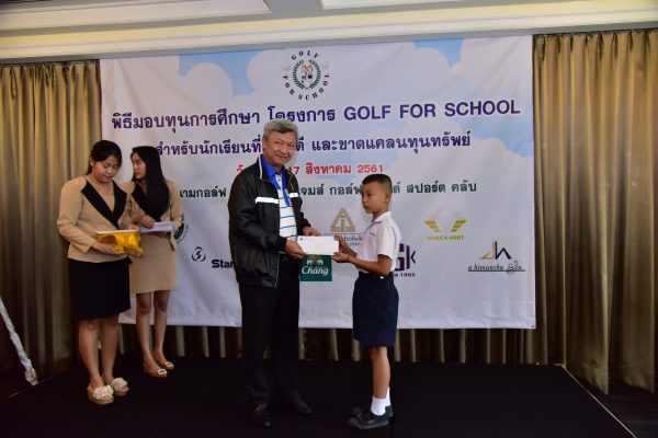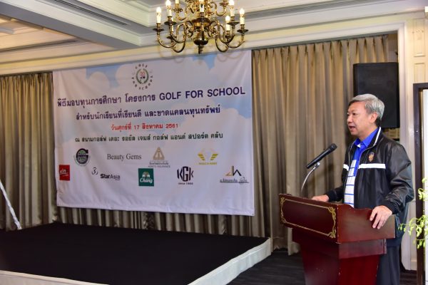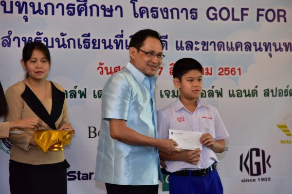 วันที่ 17 สิงหาคม 2561 ที่สนามกอล์ฟ เดอะรอยัลเจมส์ กอล์ฟแอนด์ สปอร์ตคลับ อำเภอพุทธมณฑล จังหวัดนครปฐม นายชาญนะ เอี่ยมแสง ผู้ว่าราชการจังหวัดนครปฐม เป็นประธานมอบทุนการศึกษาแก่นักเรียน นักศึกษาที่มีผลการเรียนดีแต่ขาดแคลนทุนทรัพย์ ในพื้นที่จังหวัดนครปฐม ตามโครงการ Golf for School เพื่อให้นักเรียนได้มีโอกาสศึกษาต่อในระดับที่สูงขึ้น โดยมีนายพรสิทธิ์ ศรีอรทัยกุล ประธานมูลนิธิอัญมณีไทยและเครื่องประดับ, ผู้อำนวยการโรงเรียน นักเรียน นักศึกษา เข้าร่วมพิธี และนายธนกร ศรีอรทัยกุล ประธานโครงการ Golf for School กล่าวว่า มูลนิธิอัญมณีไทยและเครื่องประดับ พร้อมด้วยผู้มีจิตเมตตาได้ร่วมกันจัดสรรทุนการศึกษาเพื่อมอบให้แก่นักเรียน นักศึกษาที่มีผลการเรียนดีแต่ขาดแคลนทุนทรัพย์ จำนวน 106 คน โดยแบ่งเป็นระดับชั้นอนุบาล และระดับประถมศึกษา ทุนละ 3,000 บาท ระดับมัธยมศึกษาตอนต้นทุนละ 4,000 บาท ระดับมัธยมศึกษาตอนปลายทุนละ 5,000 บาท และระดับปริญญาตรีทุนละ 6,000 บาท รวมทุนการศึกษา 6 แสนบาท