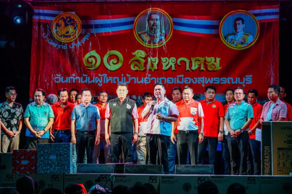 ที่หอประชุมที่ว่าการอำเภอเมืองสุพรรณบุรี นายวราวุธ ศิลปอาชา รมว.ทรัพยากรธรรมชาติและสิ่งแวดล้อม พร้อมด้วย ดร.อุดม โปร่งฟ้า ที่ปรึกษา รมว.ทรัพยากรธรรมชาติและสิ่งแวดล้อม ร่วมงานวันกำนันผู้ใหญ่บ้าน