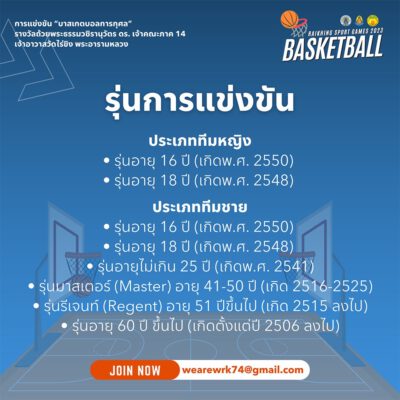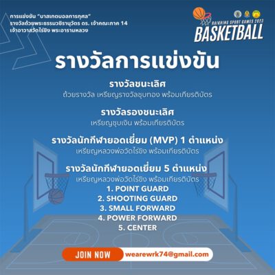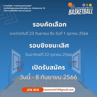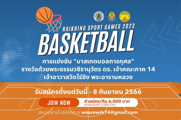 เปิดรับสมัคร ทีมเข้าร่วมการแข่งขัน “บาสเกตบอลการกุศล” ในรายการ “RAIKHING SPORT GAMES 2023” รางวัลถ้วยพระธรรมวชิรานุวัตร ดร. เจ้าคณะภาค 14 เจ้าอาวาสวัดไร่ขิง พระอารามหลวง ระหว่างวันที่ 23 กันยายน 2566-22 ตุลาคม 2566 ณโดมอเนกประสงค์ โรงเรียนวัดไร่ขิงวิทยา อำเภอสามพราน จังหวัดนครปฐม
