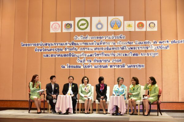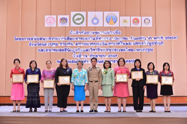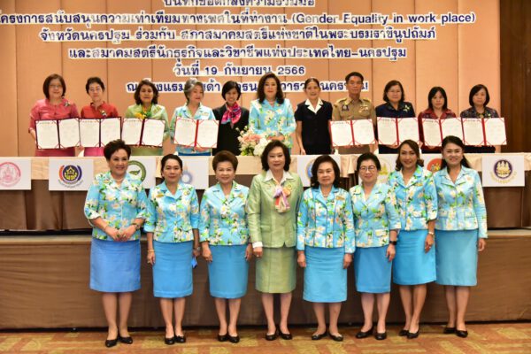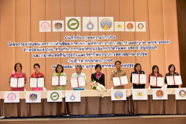 วันที่ 19 กันยายน 2566 โรงแรมไมด้า แกรนด์ ทวารวดี อำเภอเมืองนครปฐม จังหวัดนครปฐม นายยงยุทธ สวนทอง รองผู้ว่าราชการจังหวัดนครปฐม เป็นประธานในพิธีลงนามบันทึกข้อตกลงความร่วมมือโครงการสนับสนุนความเท่าเทียมทางเพศ ในที่ทำงาน โดยมี นางสาวสุกัญญา ประจวบเหมาะ ประธานสภาสมาคมสตรีแห่งชาติในพระบรมราชินูปถัมภ์ ,อธิบดีกรมกิจการสตรีและสถาบันครอบครัว ,นางวราภรณ์ เจริญศิริโชติ นายกเหล่ากาชาดจังหวัด ,นางสาวณัฏฐ์ปภาณ จันทร์ละมูล นายกสมาคมสตรีนักธุรกิจและวิชาชีพแห่งประเทศไทย – นครปฐม/กรรมการอำนวยการสภาสมาคมสตรีแห่งชาติ ในพระบรมราชินูปถัมภ์ ,นางสาวยุพิน มูลจันทะ แรงงานจังหวัด ,ผู้แทนสนง.สวัสดิการและคุ้มครองแรงงานจังหวัด ,นางอัธยา อ่ำหนองโพ จัดหางานจังหวัด,นางสาวทิพวรรณ ไชยูปถัมภ์ พัฒนาการจังหวัด และนางสาวศิริพร โรจนสุกาญจนพัฒนาสังคมและความมั่นคงของมนุษย์จังหวัด ร่วมพิธีลงนามในครั้งนี้