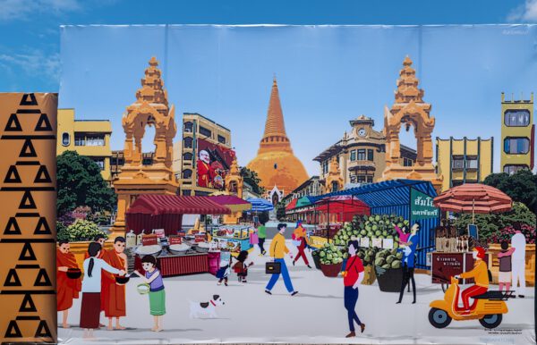 • Morning of Nakhon Pathom : สะท้อนภาพวิถีชีวิตผ่านตลาดยามเช้าหน้าสถานีรถไฟจังหวัดนครปฐม ที่มีกลิ่นอายความเป็นอัตลักษณ์ของท้องถิ่น ดั่งเช่นคำขวัญประจำจังหวัด ส้มโอหวาน ข้าวสารขาว ข้าวหลามหวานมัน พระปฐมเจดีย์สียดฟ้า ฯลฯที่อยู่ควบคู่ไปกับบริบททางสังคมปัจจุบัน สื่อสารผ่าน Digital Art สีสดใสที่แสดงถึงความเป็นอิสระในทุกด้านอย่างไม่มีข้อจำกัด ความเท่าเทียมซึ่งกันและกัน ทั้งเพศ สีผิวชนชาติ หรือเชื้อชาติ เป็นสีที่พร้อมปลดปล่อยความสดใสหลังจากเจอวิกฤตต่างๆ โดยนาย ธนภัทร ไชยพันนา ภาควิชา : ศิลปไทย คณะจิตรกรรม ประติมากรรมและภาพพิมพ์ มหาวิทยาลัยศิลปากร