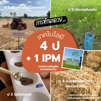 ป 4 คือ “แปรสภาพฟาง ตอซัง” การแปรสภาพฟางข้าว ปลอดการเผาสู่การไถกลบหรือส่งเสริมการทำปุ๋ยหมัก ซึ่งนอกจากจะเป็นการเพิ่มความอุดมสมบูรณ์ของดิน ยังช่วยลดหมอกควัน หรือภาวะโลกร้อนจากการเผา