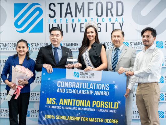 วันอังคารที่ 3 ตุลาคม 2566 เวลา 10.00-12.00น. ณ มหาวิทยาลัยนานาชาติแสตมฟอร์ด วิทยาเขตพระรามเก้า กรุงเทพฯ Ms. Anntonia Porsild (Ann) หรือ แอน– แอนโทเนีย โพซิ้ว ผู้ครองตำแหน่ง Miss Universe Thailand 2023 (MUT2023) เข้ารับทุนการศึกษาระดับปริญญาโท (ทุน 100%) กับ ดร. อภิเทพ แซ่โค้ว (รักษาการอธิการบดีมหาวิทยาลัยนานาชาติแสตมฟอร์ด) ภายในงานมีผู้บริหารกองประกวดฯ ผู้บริหารมหาวิทยาลัยฯ รวมถึงนักศึกษาไทย/ต่างชาติ และพี่ ๆ ศิษย์เก่า เข้าร่วมงานเพื่อแสดงความยินดี อีกทั้งมหาวิทยาลัยฯ ยังได้จัดงานนี้ขึ้น เพื่อแสดงความยินดีให้กับ Anntonia Porsild กับความสำเร็จในการประกวด Miss Universe Thailand 2023 ที่ผ่านมาพร้อมกับการให้กำลังใจเพื่อเข้าร่วมประกวดในเวทีระดับโลก Miss Universe 2023 ที่กำลังจะมาถึงในเดือนพฤศจิกายน 2566 นี้