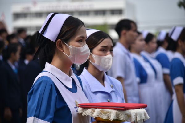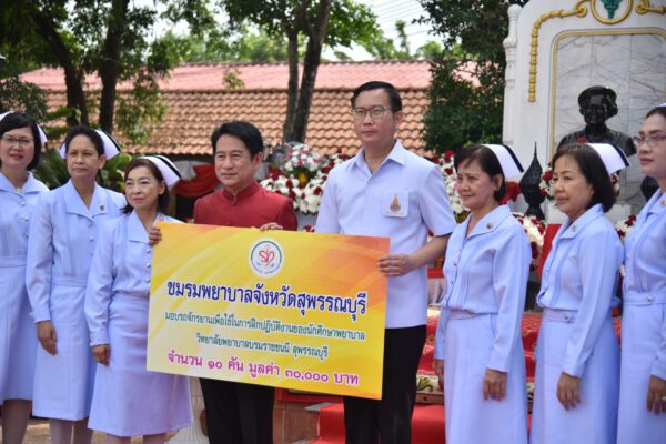 จากนั้นประกอบวิชาชีพพยาบาลและนักศึกษาพยาบาลร่วมกันร้องเพลงมาร์ชพยาบาล ต่อด้วย ชมรมพยาบาลจังหวัดสุพรรณบุรีได้มอบจักรยานเพื่อใช้ในการปฏิบัติงานของนักศึกษาวิทยาลัยพยาบาลบรมราชชนนี สุพรรณบุรี จำนวน 10 คัน มูลค่า 30,000 บาท
