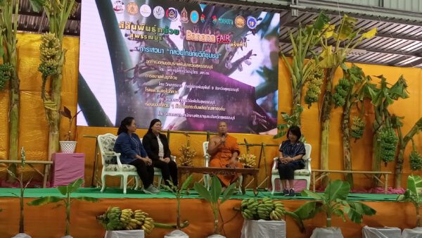 ที่ศูนย์อนุรักษ์พันธุ์กล้วยสุพรรณบุรี หลังวัดป่าเลไลยก์วรวิหาร อ.เมือง จ.สุพรรณบุรี ได้จัดเวทีเสวนา กล้วยไทยกับวิถีชุมชน ในงานสีสันพันธุ์กล้วย บานาน่าแฟร์ ครั้งที่1 วันที่26ธ.ค.66-2 ม.ค.67 ซึ่งได้รับเกียรติวิทยากรบรรยายโดย พระครูโสภณวีรานุวัตร ผศ.ดร.ประธานฝ่ายสงฆ์ ศูนย์อนุรักษ์พันธุ์กล้วยสุพรรณบุรี ในเรื่องของจุดกำเนิดศูนย์อนุรักษ์พันธุ์กล้วยสุพรรณบุรี การขยายพันธุ์กล้วย โดย น.ส.คณิษฐา ลิลา นักวิชาการส่งเสริมการเกษตรชำนาญการ ศูนย์ขยายพันธุ์พืชที่9 สุพรรณบุรี โรคและแมลงในกล้วย โดย น.ส.ภัควรินทร์ พัฒนมณีศักดิ์ นักวิชาการส่งเสริมการเกษตรชำนาญการ ศูนย์ส่งเสริมเทคโนโลยีการเกษตรด้านอารักขาพืช สุพรรณบุรีและเรื่องของกล้วยๆกับการยกระดับผลิตภัณฑ์ท้องถิ่น โดยน.ส.ศิริกร นิลกำแหง พัฒนาชุมชนจังหวัดสุพรรณบุรี ซึ่งกล้วยน้ำว้ามีประโยชน์มากมายและผูกพันอยู่คู่กับคนไทย ตั้งแต่เกิดยันตายและสามารถนำไปต่อยอดเพิ่มมูลค่าได้อีกหลายอย่าง ทั้งอาหารและสิ่งทอ หรือเกษตรกรสามารถนำไปผลิตภาคอุตสาหกรรมได้ โดยเลือกใช้ต้นพันธุ์กล้วยที่มีขนาดสม่ำเสมอ ซึ่งการปลูกกล้วยมีการลงทุนที่ค่อนข้างต่ำ การดูแลไม่ยุ่งยาก จะต้องมีการบำรุงรักษา ดิน น้ำ ให้เหมาะกับการเจริญเติบโตของกล้วย ในเรื่องของตลาดรับซื้อกล้วย จะมีหลายแนวทาง ทั้งรับประทานผลสดและการแปรรูป จะมีช่องทางหลายๆอย่างที่ทำให้กล้วยไปได้ดี ในส่วนเกษตรกรและผู้ที่สนใจปลูกกล้วย สามารถศึกษาข้อมูลก่อน โดยปรึกษาติดต่อกับหน่วยงานราชการเกษตรและทางโซเชียลเรื่องการปลูกกล้วยได้