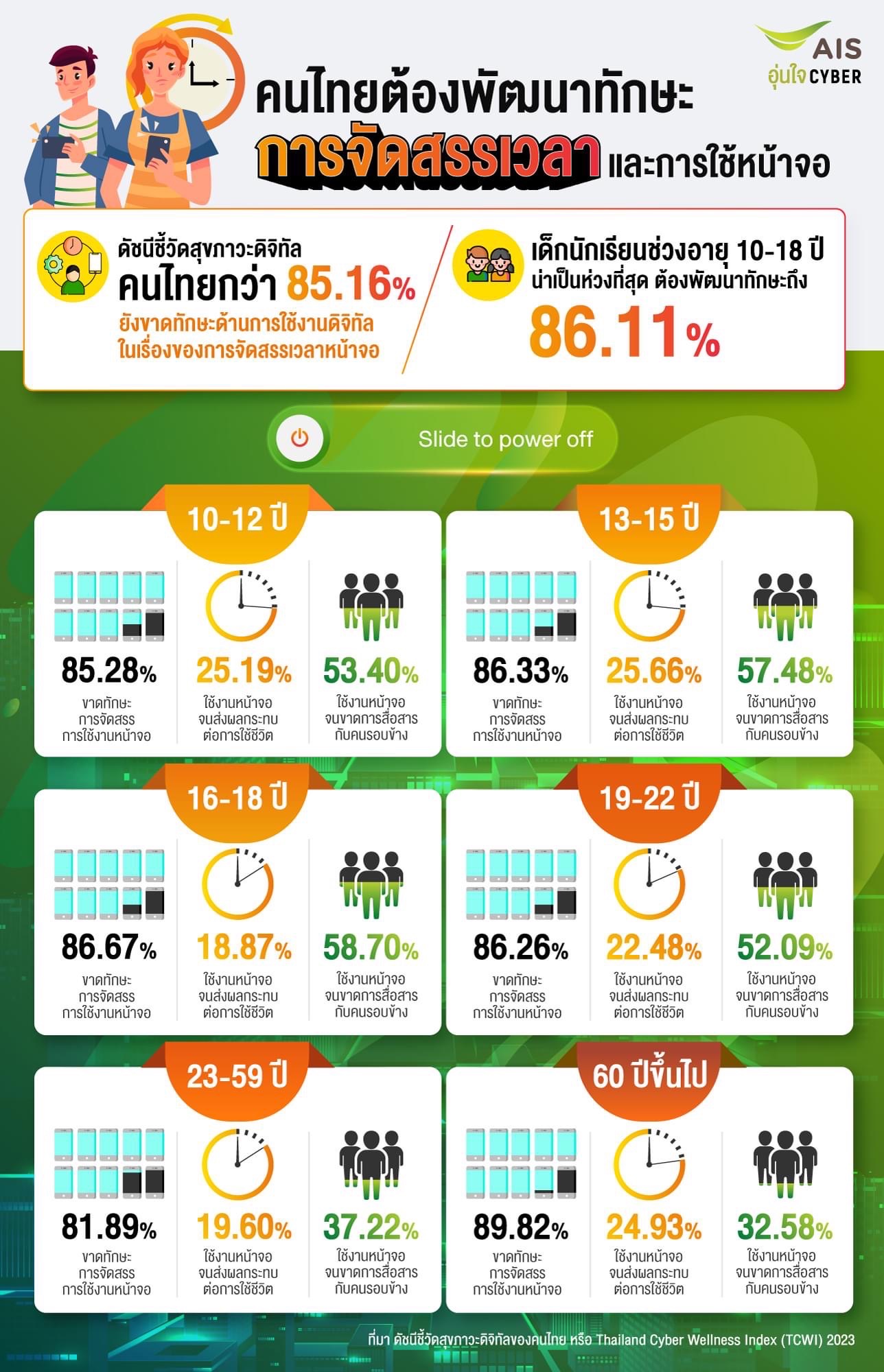 สามารถอ่านรายละเอียดผลการศึกษาดัชนีชี้วัดสุขภาวะดิจิทัลของคนไทย เพิ่มเติมที่ https://sustainability.ais.co.th/storage/update/report/advanc-ebook-thailand-cyber-wellness-th.pdf