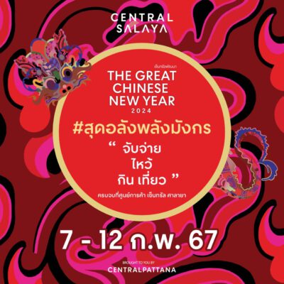 ศูนย์การค้าเซ็นทรัล ศาลายา ร่วมกับ มหาวิทยาลัยศิลปากร จัดงาน The great chinese new year 2024 ร่วมสร้างสรรค์ประติมากรรมมังกรหัตถศิลป์มงคล จากสินค้าอัตลักษณ์ท้องถิ่น ที่ถ่ายทอดความเชื่อมโยงของธรรมชาติกับชุมชน ได้อย่างงดงาม เป็น Local Essence โดยนำกล้วยไม้หลากสีสัน กว่า 90,000 ดอก ประกอบร่างกลายเป็นมังกรหัตถศิลป์ ออกมาเป็น ความสวยงามของ ” Orchid Dragon ” (มังกรดอกกลวยไม้) หนึ่งเดียวของประเทศไทย เป็นงานศิลป์สะท้อนอัตลักษณ์ประจำท้องถิ่น ถือเป็นตัวแทนแห่งความก้าวหน้าเจริญมั่งคั่งสูงสุด เพื่อฉลองเทศกาลตรุษจีน จัดเต็มกับกิจกรรม จับจ่าย ไหว้ กิน เที่ยว อาทิ – ชมการแสดงสิงโต และมังกรทอง สุดอลังการ – ชมการประกวดหนูน้อย Little Dragon)- โชว์เปลี่ยนหน้ากาก – การแสดงดนตรีจีน – เชิญสักการะสิ่งศักดิ์สิทธิ์ พระโพธิสัตว์กวนอิม , เทพเจ้ากวนอู เพื่อเสริมความสิริมงคล – Workshop ประดิษฐ์มังกรของเล่น- ช้อปสินค้ามงคล – ถ่ายรูปเช็คอินกับจุด Decoration ทั่วศูนย์การค้าฯ