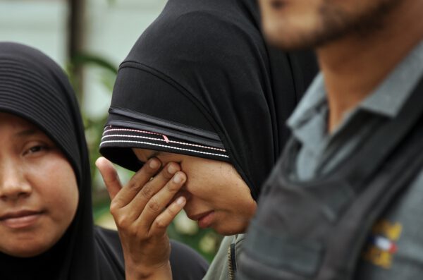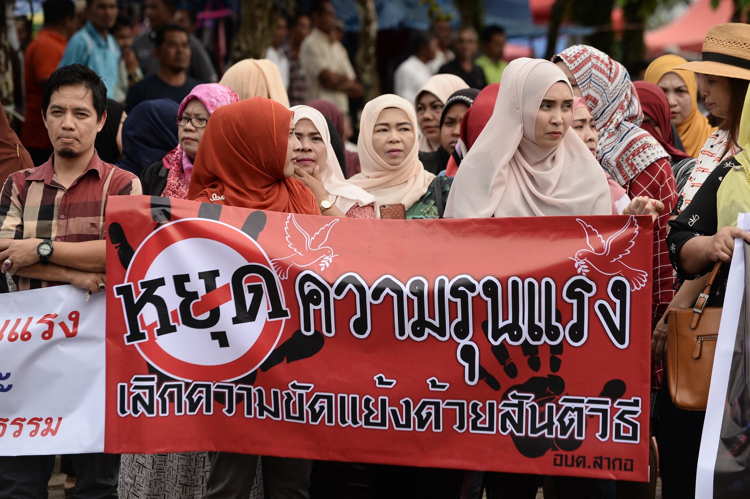 The wife of a Muslim man who was shot dead reacts as Thai police officers inspect his body in the Rangae district of Thailand’s restive southern province of Narathiwat on October 5, 2015. Since 2004 more than 6,400 people have been killed, the majority civilians, in the kingdom’s Muslim-majority southern provinces where insurgents are fighting for greater autonomy. AFP PHOTO / Madaree TOHLALA (Photo credit should read MADAREE TOHLALA/AFP via Getty Images)