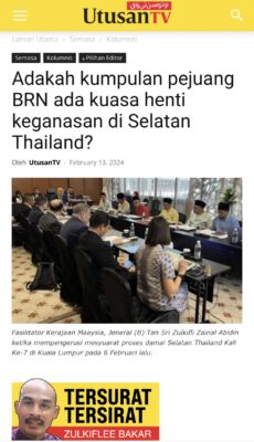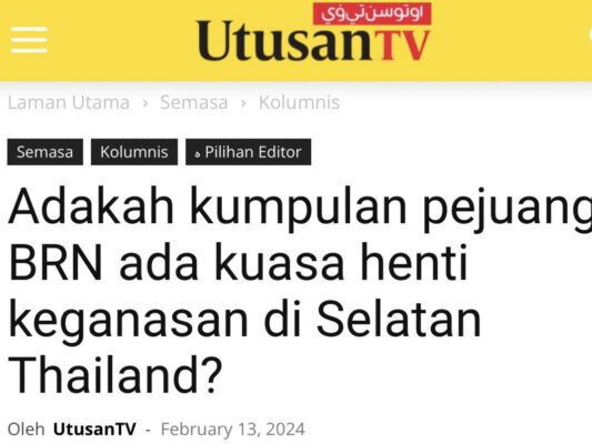 (วันที่ 14 กพ. 67) ผู้สื่อข่าวประจำสำนักข่าวออนไลน์นิวส์ ได้เปิดเผยว่า สำนักข่าว UtusanTv ของมาเลเซีย ได้นำเสนอบทความสำคัญที่เกี่ยวกับกระบวนการพูดคุยสันติภาพ ระหว่างรัฐบาลไทย กับแนวร่วมปฏิวัติแห่งชาติมลายูปัตตานี (บีอาร์เอ็น) ซึ่งได้มีขึ้นเมื่อต้นเดือนกุมภาพันธ์ที่ผ่านมา โดยผู้เขียนบทความครั้งนี้ ยังได้ตั้งคำถามหลายเรื่อง ในหลายสิ่งที่คณะทั้งสองได้ตั้งโต๊ะพูดคุยกันเพื่อหวังว่า “กระบวนการพูดคุยที่มีขึ้นหลายครั้งจะสามารถยุติหรือหยุดยั้งเหตุความรุนแรงในพื้นที่ จชต.ของไทยได้หรือไม่ (เมื่อไร) การตั้งหัวบทความครั้งนี้ ถือเป็นเรื่องสำคัญที่คนไทย โดยเฉพาะรัฐบาลไทยหวังที่จะให้เกิดขึ้น แต่จริงหรือไม่ !!