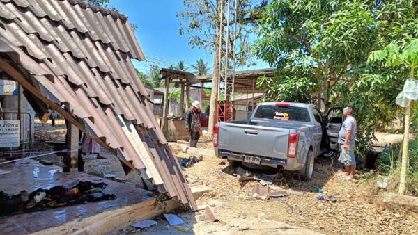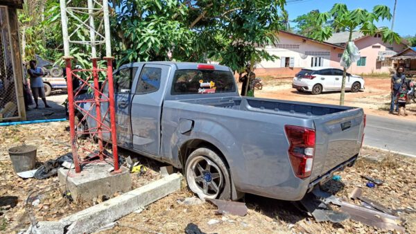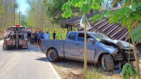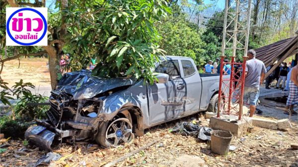 ส่วนรถยนต์กระบะยี่ห้ออีซูซุ สีเทา หมายเลขทะเบียน ผพ 3731 สงขลา จอดสงบนิ่งส่วนหน้ารถอัดก๊อปปี้กับต้นมะม่วงสภาพพังยับ