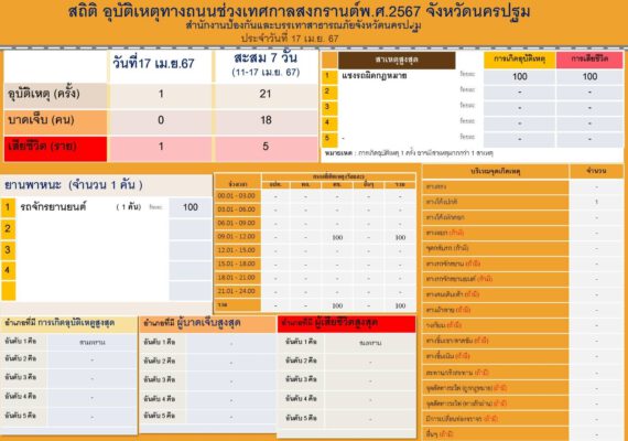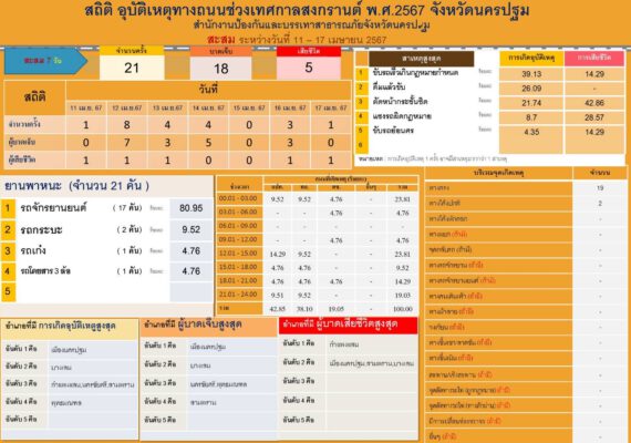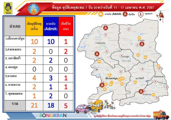 วันที่ 18 เมษายน 2567 ที่ห้องประชุมศาลากลางจังหวัดนครปฐม นายสุรศักดิ์ เจริญศิริโชติ ผู้ว่าราชการจังหวัดนครปฐม พร้อมด้วย นายธีรยุทธ์ จันทร์ดิษฐวงษ์ รองผู้ว่าราชการจังหวัด หัวหน้าส่วนราชการที่เกี่ยวข้อง แถลงผลและปิดศูนย์ปฏิบัติการป้องกันและลดอุบัติเหตุทางถนนช่วงเทศกาลสงกรานต์ 2567 จังหวัดนครปฐม ตั้งแต่วันที่ 11 – 17 เมษายน ที่ผ่านมา ภายใต้หัวข้อการรณรงค์ “ขับขี่ปลอดภัย เมืองไทยไร้อุบัติเหตุ” เกิดอุบัติเหตุ 21 ครั้ง บาดเจ็บ จำนวน 18 ราย เสียชีวิต จำนวน 5 ราย