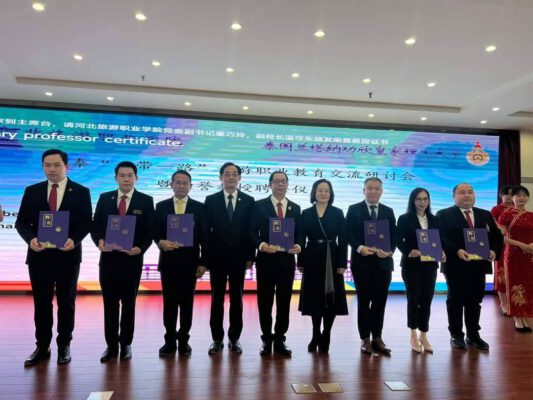 วันศุกร์ที่ 26 เมษายน 2567 มทร.รัตนโกสินทร์ นำโดย พลเอก จรัล กุลละวณิชย์ นายกสภามหาวิทยาลัย พร้อมด้วย รศ.ดร.อุดมวิทย์ ไชยสกุลเกียรติ อธิการบดี และคณะผู้บริหาร เข้าร่วมการสัมมนาในหัวข้อ China-Thailand : Belt and Road Initiative Tourism Vocational Education Exchange และศึกษาดูงานวิทยาลัยอาชีวศึกษาด้านการท่องเที่ยวแห่งมณฑลเหอเป่ย และหารือแนวทางการทำความร่วมมือระหว่างกันโดยเฉพาะการจัดการศึกษาต่อยอดจากระดับอนุปริญญาในระดับปริญญาตรีให้แก่นักศึกษาของวิทยาลัยอาชีวศึกษามณฑลเหอเป่ย ตลอดจนความร่วมมือทางวิชาการ การจัดการเรียนการสอน หลักสูตรและแนวทางการจัดการเรียนการสอนร่วมกันในอนาคตต่อไป ทั้งนี้ทางวิทยาลัยอาชีวศึกษา โดยมี Dong Qiaoling, Deputy Secretary of the Party Committee of Hebei Tourism Vocational College , Wen Shoudong is the vice president of Hebei Tourism Vocational College , Wu Cuihua is the director of the International , Exchange and Cooperation Center of Hebei Tourism Vocational College , Li Zhiyong is the deputy director of the International Exchange and Cooperation Center of Hebei Tourism Vocational College , Gao Yanfeng, Deputy Director of the International Exchange and Cooperation Center of Hebei Tourism Vocational College ร่วมให้การต้อนรับ ณ Hebei Tourism College มณฑลเหอเป่ย สาธารณรัฐประชาชนจีน
