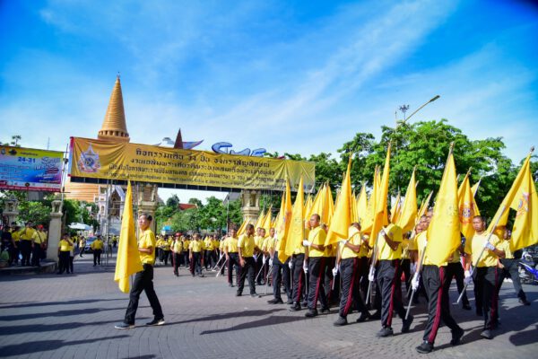 วันที่ 6 มิถุนายน 2567 ที่บริเวณลานหน้าพระร่วงโรจนฤทธิ์ องค์พระปฐมเจดีย์ อำเภอเมือง จังหวัดนครปฐม นายสุรศักดิ์ เจริญศิริโชติ ผู้ว่าราชการจังหวัดนครปฐม นำข้าราชการ นักเรียน นักศึกษา และประชาชนชาวจังหวัดนครปฐม ร่วมกิจกรรมเดิน วิ่ง ปั่นธงตราสัญลักษณ์ เฉลิมพระเกียรติพระบาทสมเด็จพระเจ้าอยู่หัว เนื่องในโอกาสพระราชพิธีมหามงคลเฉลิมพระชนมพรรษา 6 รอบ 28 กรกฎาคม 2567 หลังจากรับมอบธงตราสัญลักษณ์ฯ จากจังหวัดราชบุรี เมื่อวันที่ 4 มิถุนายน ที่ผ่านมา พร้อมทั้งจัดกิจกรรมเฉลิมฉลองธงตราสัญลักษณ์ฯ ณ ศาลากองอำนวยการ องค์พระปฐมเจดีย์ ได้แก่นิทรรศการเฉลิมพระเกียรติพระบาทสมเด็จพระเจ้าอยู่หัว เกี่ยวกับพระราชประวัติและพระราชกรณียกิจ การฉายภาพยนตร์เฉลิมพระเกียรติเกี่ยวกับประวัติศาสตร์ชาติไทย และสารคดีเฉลิมพระเกียรติ อีกทั้งมีการแสดงทางวัฒนธรรม การแสดงพื้นบ้าน ศิลปวัฒนธรรมท้องถิ่น รำบวงสรวงองค์พระปฐมเจดีย์ การแสดงบาสโลป อีกทั้งกิจกรรมจิตอาสาบำเพ็ญสาธารณประโยชน์และบำเพ็ญสาธารณกุศล ตลอดจนการแสดงเฉลิมพระเกียรติ การบรรเลงดนตรีบทเพลงพระราชนิพนธ์ และการแสดงดนตรีลูกทุ่ง จากโรงเรียนต่างๆ