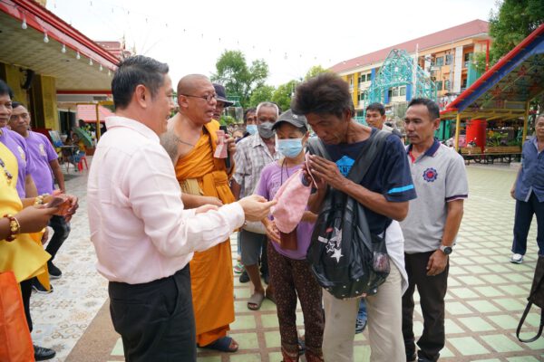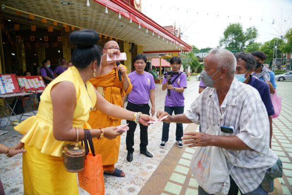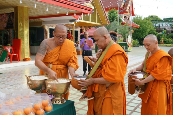 จากนั้น ได้มีการแจกทานเป็นเงินสดโดยคณะศิษยานุศิษย์ได้ร่วมกันแจกทานให้กับคนยากไร้ที่เข้ามารอรับบริเวณหน้าวัดตั้งแต่ช่วงเช้า คนละ 100 บาท ซึ่งมีประชาชนที่ทราบข่าวต่างมารอคิว ซึ่งเป็นบรรยากาศที่มีความสุขทั้งผู้ให้และผู้รับและถวายเป็น บุญกุศลให้กับหลวงพี่น้ำฝน ต่อมา ได้มีการถวายภัตตาหารเพลให้กับคณะสงฆ์ 100 กว่ารูป และจัดให้มีการตั้งร้านแจก อาหารและเครื่องดื่มให้กับผู้เข้าร่วมงานได้ร่วมกันรับประทานฟรีตั้งแต่ช่วงเช้าจนถึงเที่ยง ซึ่งหลังจาก คณะสงฆ์ได้ฉันเพลเสร็จได้มีผู้ยากไร้เข้ามาต่อคิวรับประทานอาหารก้นบาตร เพื่อความเป็นสิริมงคลและประทังความหิวโดยเป็นหนึ่งกิจกรรมที่คณะสงฆ์และศิษยานุศิษย์ได้ร่วมกันจัดขึ้น โดยปรากฏว่ามีผู้เข้ามาร่วมรับประทานในโรงทานดังกล่าวหลายร้อยคน จนต้องมีการจัดระเบียบเพื่อความเรียบร้อยก่อนเสร็จพิธีทั้งหมดในช่วงเวลาเย็น