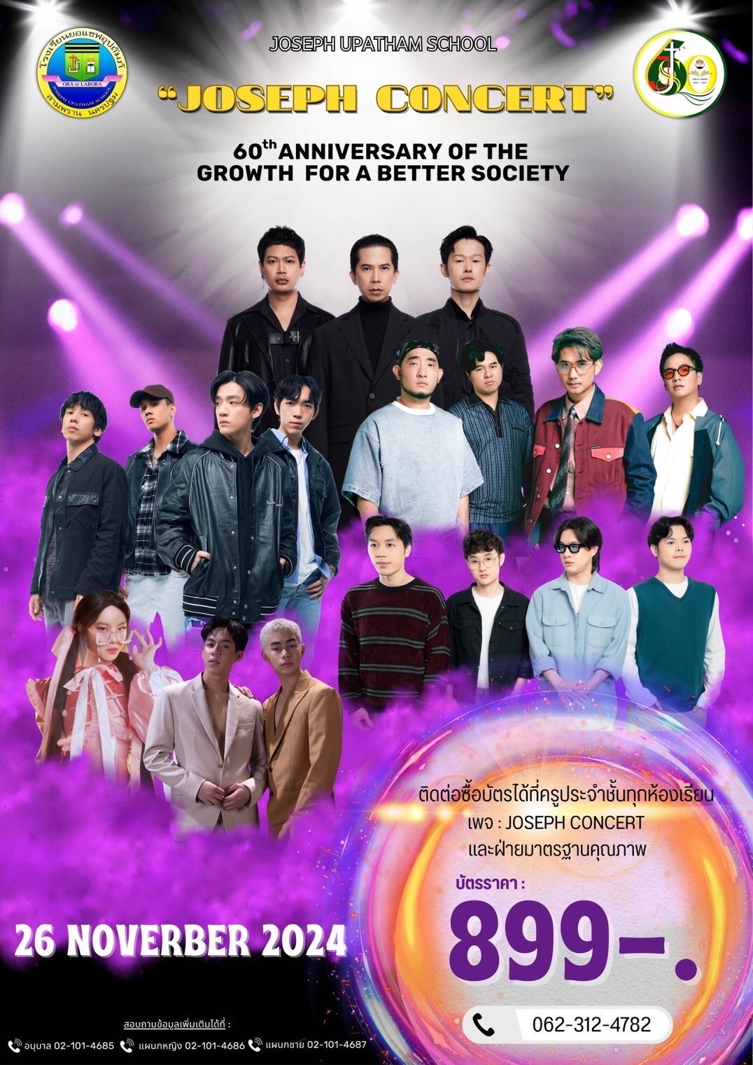 วันที่ 26 มิถุนายน 2567 เวลา 13.00 ณ ห้องประชุมยอห์นที่23 โรงเรียนยอแซฟอุปถัมภ์ นำโดย บาทหลวง สุชาติ อุดมสิทธิพัฒนา ผู้อำนวยการโรงเรียนยอแซฟอุปถัมภ์ สามพราน นครปฐม และ คณะกรรมการบริหารการจัดงาน จัดแถลงข่าวคอนเสิร์ตการกุศลฉลองครบรอบ 60 ปี ในงาน JOSEPH CONCERT 60th Anniversary of The growth for a Better Society ครบรอบ 60 ปี การเติบโตเพื่อร่วมพัฒนาสังคม ในวันที่ 26 พฤศจิกายน 2567 เวลา 16.00-22.00 ณ สนามฟุตบอลใหญ่