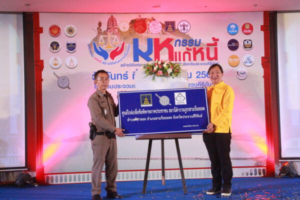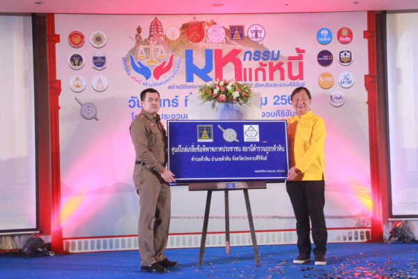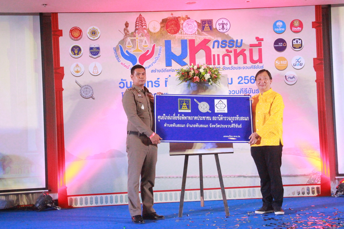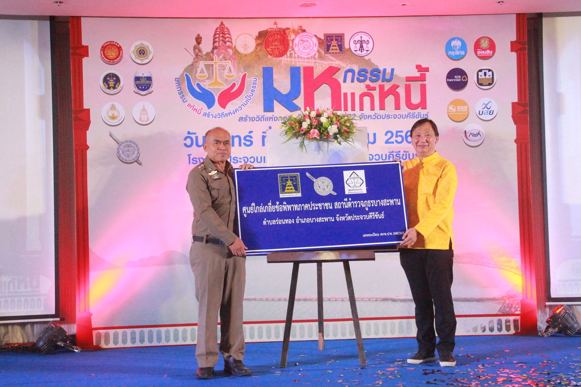 จากนั้น ผู้ช่วยรัฐมนตรีฯ ประธานในพิธี ได้มอบป้ายศูนย์ไกล่เกลี่ยข้อพิพาทภาคประชาชนประจำสถานีตำรวจภูธรฯจำนวน 8 แห่ง ประกอบด้วย 1. ศูนย์ไกล่เกลี่ยข้อพิพาทภาคประชาชน สภ.เมืองประจวบฯ 2. ศูนย์ไกล่เกลี่ยฯ สภ.หัวหิน 3. ศูนย์ไกล่เกลี่ยฯ สภ.ปราณบุรี 4. ศูนย์ไกล่เกลี่ยฯ สภ.สามร้อยยอด 5. ศูนย์ไกล่เกลี่ยฯ สภ.ทับสะแก 6. ศูนย์ไกล่เกลี่ยฯ สภ.ธงชัย อ.บางสะพาน 7. ศูนย์ไกล่เกลี่ยฯ สภ.บางสะพาน 8. ศูนย์ไกล่เกลี่ยฯ สภ.บางสะพานน้อย
