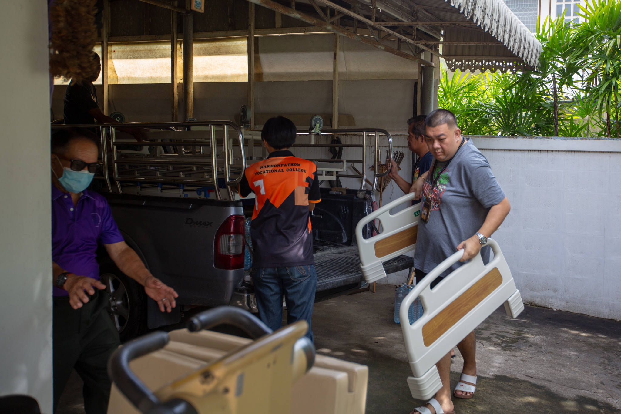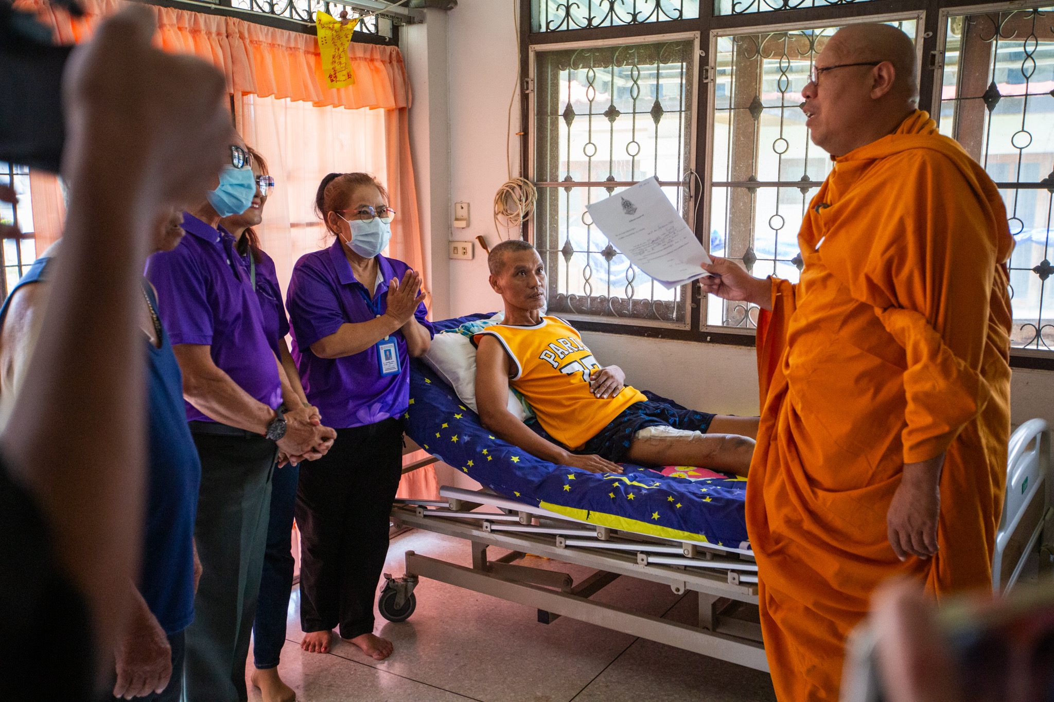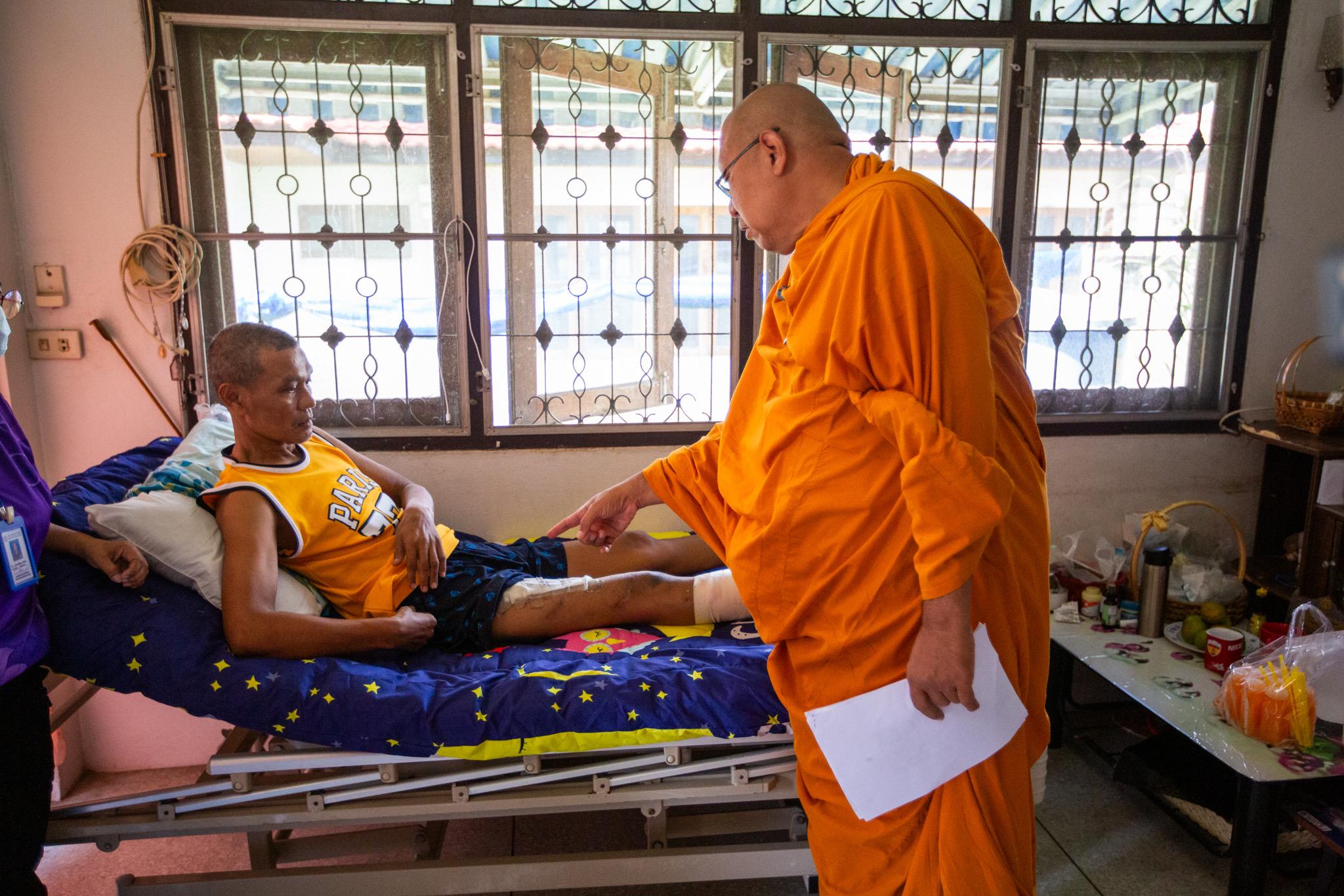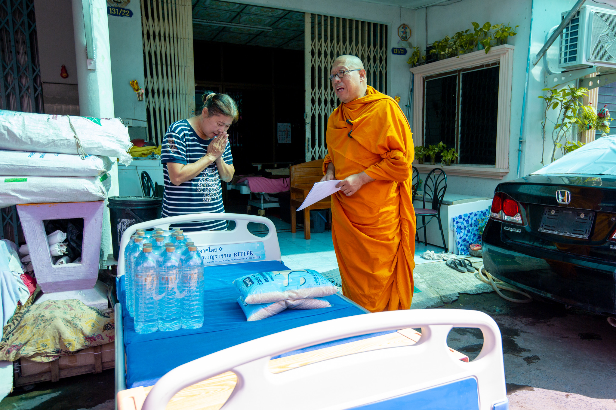 โดยหลวงพี่น้ำฝน เจ้าอาวาสวัดไผ่ล้อม ได้นำเตียงผู้ป่วยพร้อมด้วยเครื่องยังชีพ มอบให้ ร.ต.ต.อัชสิทธิ์ น้ำดอกไม้ รอง สวป. สภ.เมืองนครปฐม อายุ 55 ปี ภายในบ้านเลขที่ 226/15 ซอยร่วมจิต7/ 1 ถนน 25 มกราคม ตำบลพระปฐมเจดีย์อำเภอเมือง จังหวัดนครปฐม ซึ่งประสบอุบัติเหตุทางรถยนต์ ส่วนอีกราย คือ ร.ต.ท.โอภาส กิจสมัย อายุ 55 ปี เจ้าหน้าที่ประจำห้องวิทยุ สภ.เมืองนครปฐม ที่บ้านเลขที่ 33/2 ม.8 ตำบลบ่อพลับอำเภอเมือง จังหวัดนครปฐมโดยมีอาการนอนติดเตียงไม่สามารถไปปฏิบัติหน้าที่ได้