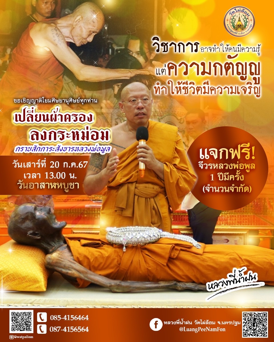 สำหรับผู้ที่สนใจเข้าร่วมพิธีในเวลา 13.00 น. วันเสาร์ที่ 20 กรกฎาคม ควรแต่งกายด้วยเสื้อผ้าและสีสุภาพ ตั้งจิตให้สงบเพื่อระลึกถึงความดี ตั้งใจประพฤติอยู่ในสมาธิขณะร่วมพิธี โดยเป็นการจัดพิธีโดยไม่มีค่าใช้จ่ายใดใดทั้งสิ้น ผู้ที่สนใจสามารถโทรสอบถามได้ที่ 085-4156464 และ 087-4156564 Line @watpailom หรือท่านที่มีสามารถมาร่วมพิธี ติดตามรับชมการไลฟ์สด ที่ Panfage : คิดไม่ออกบอกหลวงพี่น้ำใน ในวันเวลาดังกล่าว
