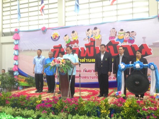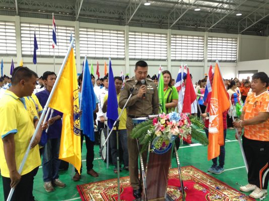 พร้อมด้วย พันโท ด็อกเตอร์สินทพ แก้วพิจิตรนายกสมาคมกีฬาแห่งจังหวัดนครปฐม และนายสุนา วงษ์ละคร ปลัดอาวุโสอำเภอสามพราน ผู้แทนองค์กรปกครองส่วนท้องถิ่น โรงพยาบาลสามพราน โรงพยาบาลเมตตาประชารักษ์(วัดไร่ขิง)สถานศึกษา และนักกีฬาในแต่ละชุมชนของเทศบาลตำบลบางกระทึก เข้าร่วมการแข่งขันกีฬาพื้นบ้าน จำนวนมาก ซึ่งสนามกีฬาระดับอำเภออำเภอสามพราน แห่งนี้ สร้างอยู่ในที่ดินของวัดดอนหวาย ซึ่งได้รับความเมตตาจากท่านเจ้าคุณพระเมธีธรรมานันท์ เจ้าอาวาสวัดดอนหวาย อนุญาตให้ใช้พื้นที่ในการก่อสร้าง โดยมีเนื้อที่จำนวน 25 ไร่2งาน 40 ตารางวา และวัดได้ซื้อที่ดินทางเข้าเพิ่มจำนวน 100 ตารางวา ส่วนงบประมาณในการก่อสร้างใช้งบประมาณของกรมพละศึกษา ประจำปีงบประมาณ 2557 จำนวน 24.5 ล้านบาท
