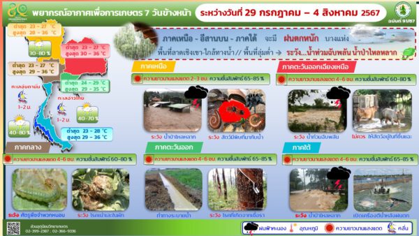 คำแนะนำสำหรับการเกษตรภาคกลาง ระยะนี้จะมีปริมาณฝนลดลง เกษตรกรควรเร่งสำรวจทางระบายน้ำออกจากแปลงปลูกให้พร้อมใช้งานได้เพื่อป้องกันน้ำขังในพื้นที่การเกษตรนาน ส่วนในบางที่เคยมีฝนตกชุกติดต่อกัน ทำให้ดินและอากาศมีความชื้นสูง เกษตรกรควรป้องกันโรคพืชที่เกิดจากเชื้อรารวมทั้งผลผลิตที่เก็บเกี่ยวมาแล้วควรระวังความชื้นสะสมที่ทำให้เกิดเชื้อราในโรงเก็บผลผลิตไว้ด้วย สำหรับผู้ที่เลี้ยงสัตว์ควรหมั่นสังเกตบริเวณโรงเรือนเพราะอาจมีสัตว์มีพิษหรือศัตรูสัตว์เข้ามาอาศัยหลบซ่อนในบริเวณโรงเรือนทำให้สัตว์เลี้ยงตื่นและอาจทำร้ายสัตว์เลี้ยงได้ หากพบควรรีบจัดการให้ออกไปจากโรงเรือน สำหรับบางพื้นที่ที่ฝนตกไม่สม่ำเสมอ เกษตรกรควรระวังศัตรูพืชจำพวกหนอนกัดกินส่วนต่างๆของพืช ส่งผลให้พืชชะงักการเจริญเติบโตได้
