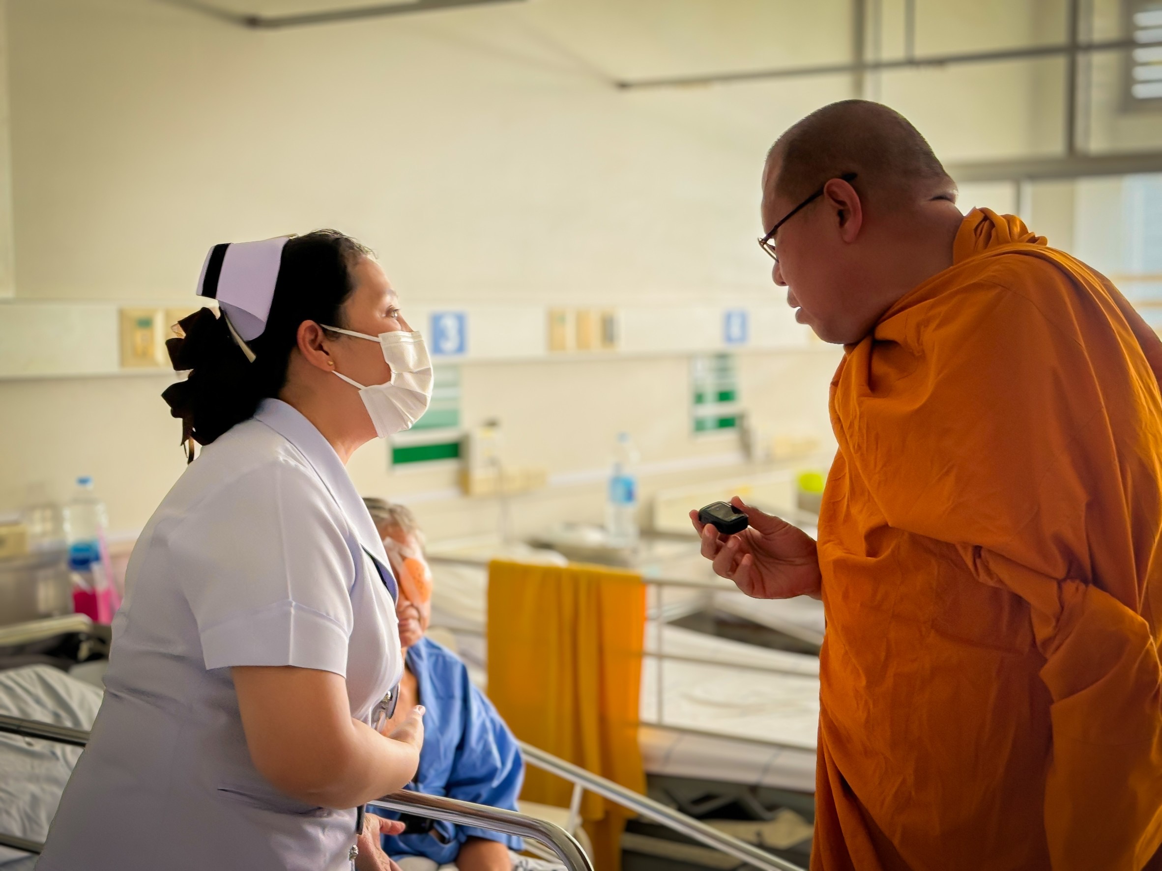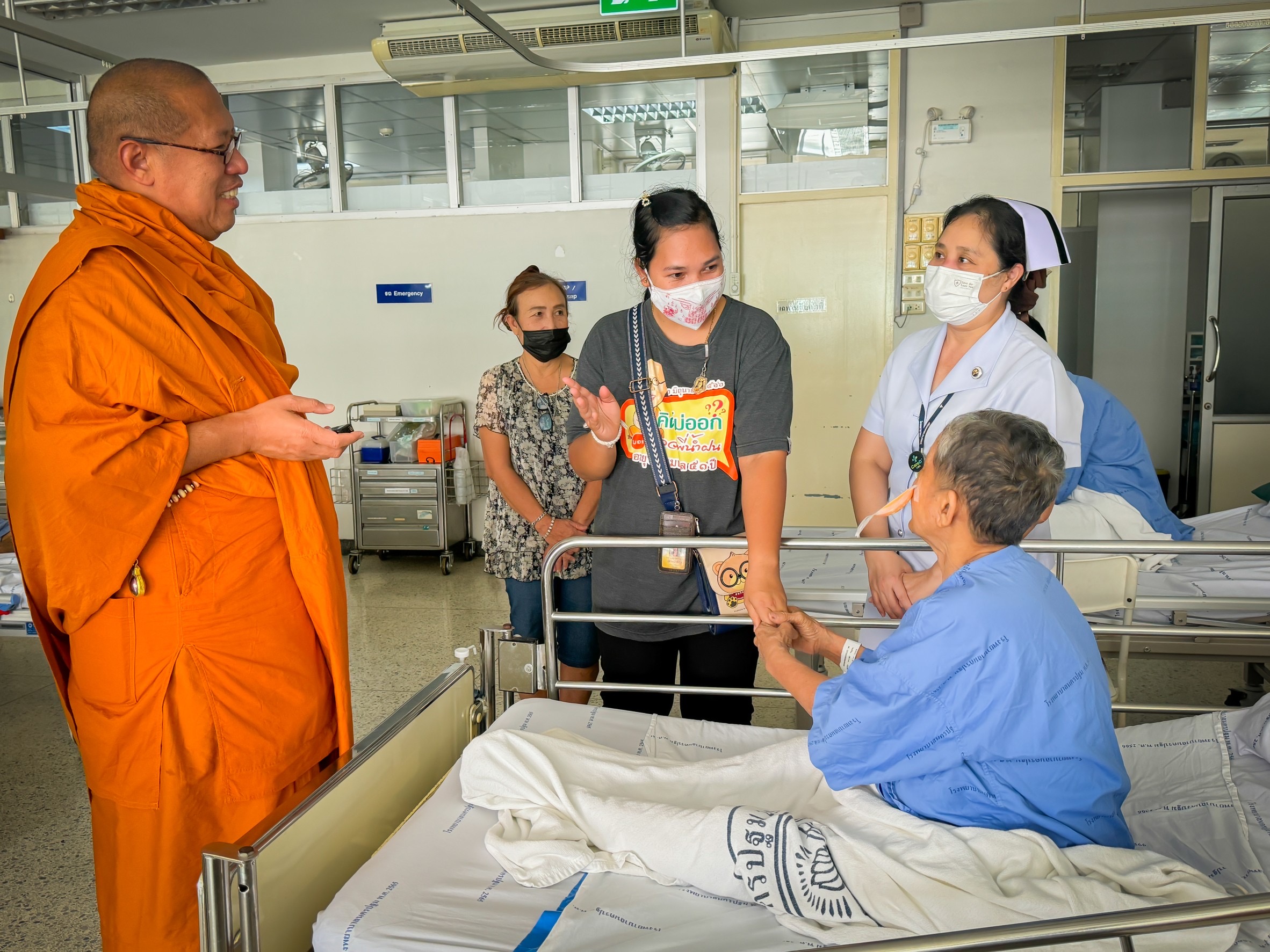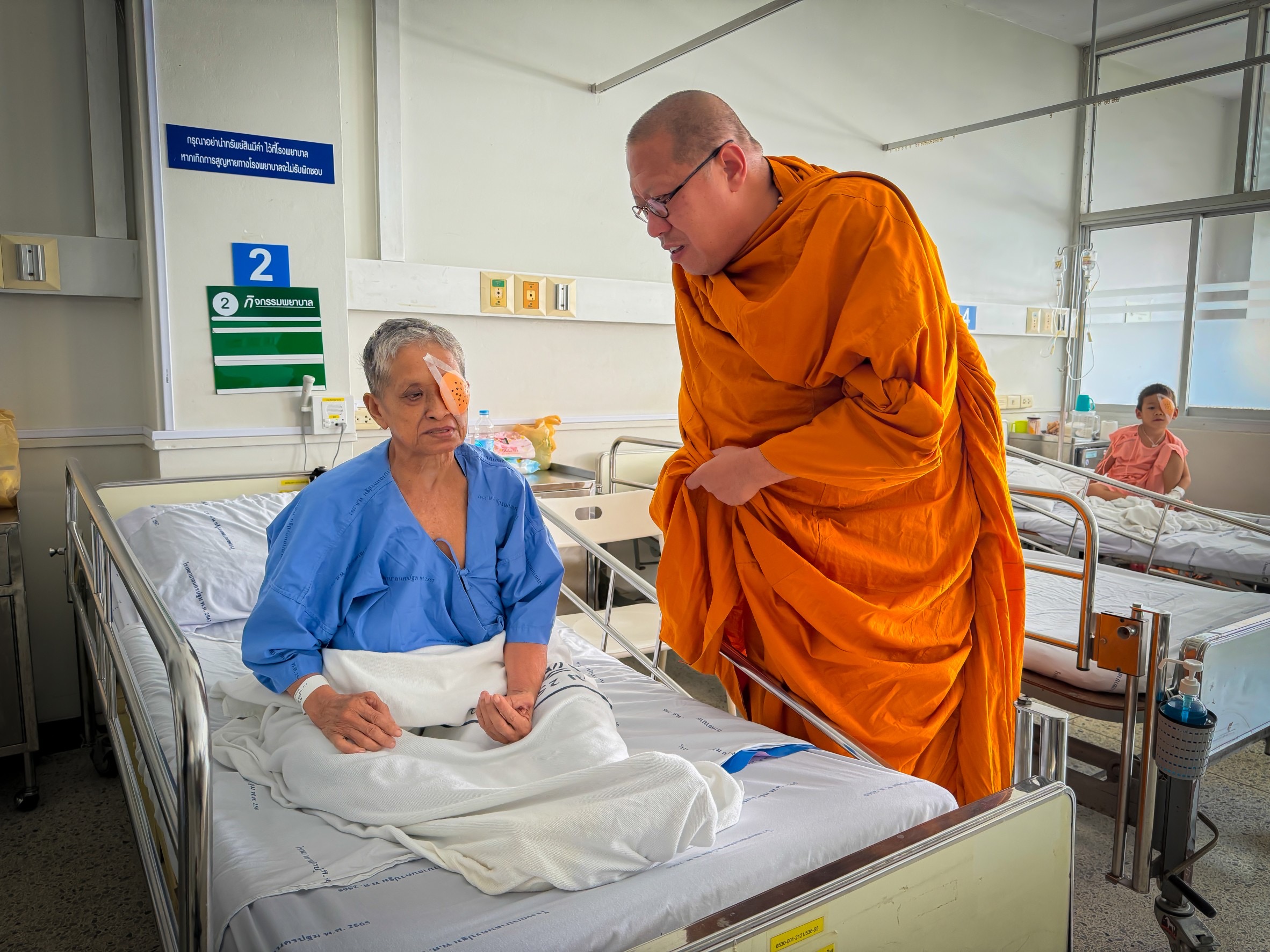 จากนั้นหลวงพี่น้ำฝน ประสานไปยังไปยังนายแพทย์สุรชัย โชคครรชิต ผู้อำนวยการโรงพยาบาลนครปฐมและได้นำตัวคุณยายห้อง ไปตรวจสุขภาพที่โรงพยาบาลนครปฐม พบว่าดวงตาซ้ายเป็นต้อกระจกต้องได้รับการผ่าตัดด่วนเนื่องจากเรื้อรังมานาน ทำให้ดวงตาเคืองทุกครั้งที่มีแสงส่องมากระทบ ส่วนที่ขาทั้ง 2 ข้างเดินไม่ได้เป็นความเรื้อรังจากอุบัติเหตุที่ส่งผลมาถึงไม่สามารถผาตัดแก้ไขได้เพราะล่วงเลยเวลามานานแล้ว และได้ประสาน รองนายก อบต.สระกระเทียม , ประธาน อสม.ตำบลสระกระเทียม ผู้นำชุมชน ให้เข้ามาช่วยกันทำความสะอาดบ้านเนื่องจากมีฝุ่นและสิ่งของหมักหมมมานาน และได้ส่งเจ้าหน้าที่เข้าไปช่วยติดไฟและแก้ไขปัญหาเกี่ยวกับระบบไฟฟ้าให้ใหม่ทั้งหมดเพื่อให้สามารถใช้ชีวิตได้สะดวกมากกว่าเดิม