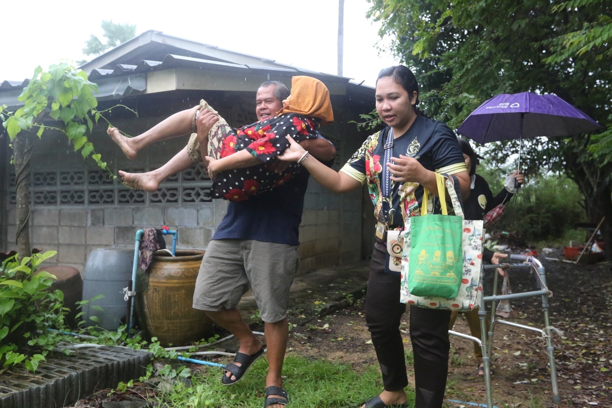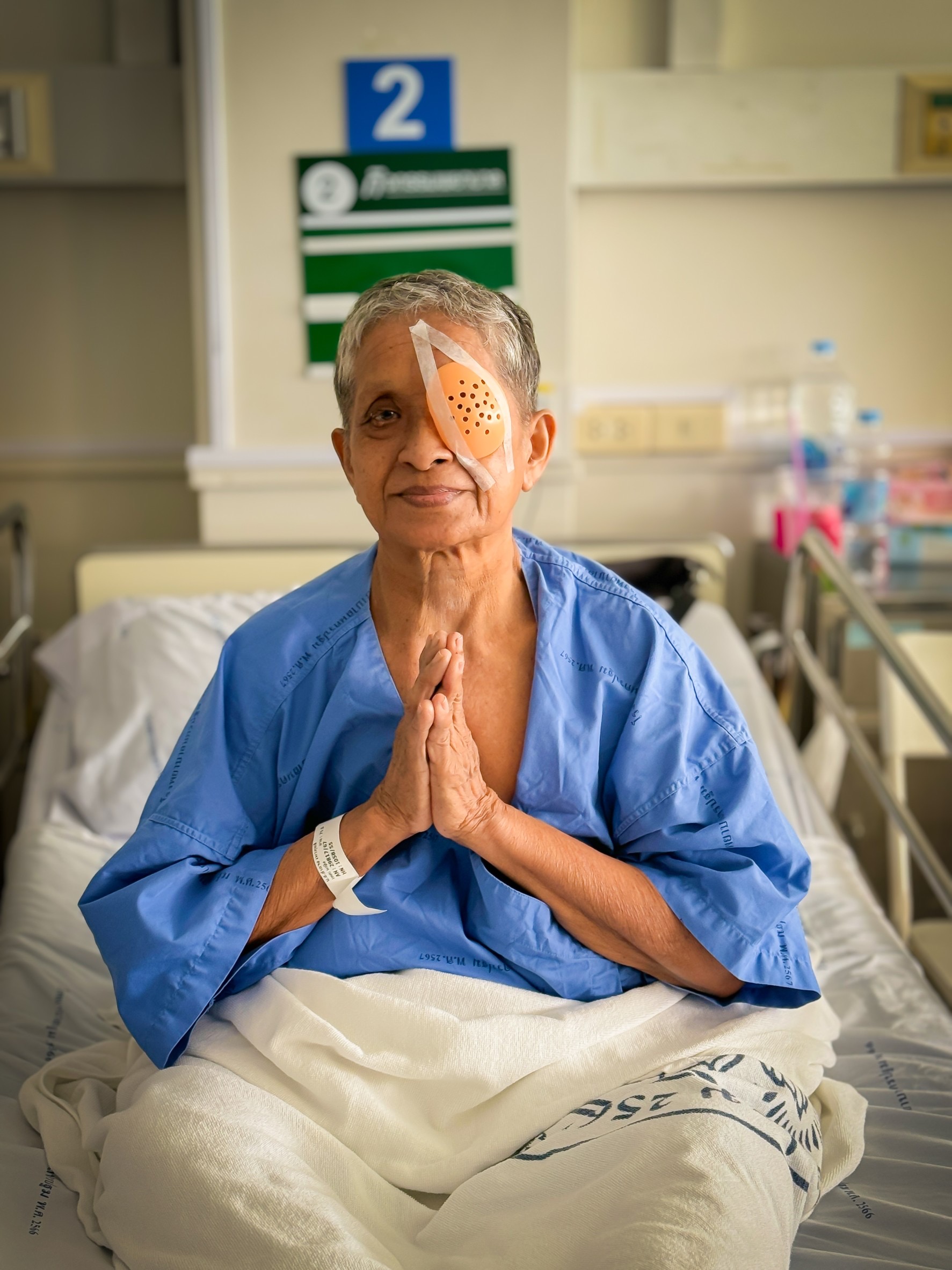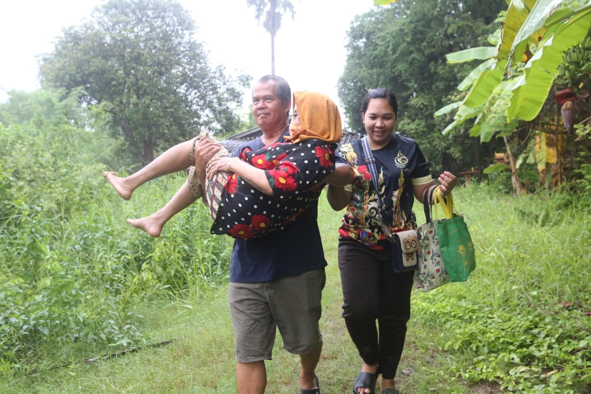 จากนั้นหลวงพี่น้ำฝน ประสานไปยังไปยังนายแพทย์สุรชัย โชคครรชิต ผู้อำนวยการโรงพยาบาลนครปฐมและได้นำตัวคุณยายห้อง ไปตรวจสุขภาพที่โรงพยาบาลนครปฐม พบว่าดวงตาซ้ายเป็นต้อกระจกต้องได้รับการผ่าตัดด่วนเนื่องจากเรื้อรังมานาน ทำให้ดวงตาเคืองทุกครั้งที่มีแสงส่องมากระทบ ส่วนที่ขาทั้ง 2 ข้างเดินไม่ได้เป็นความเรื้อรังจากอุบัติเหตุที่ส่งผลมาถึงไม่สามารถผาตัดแก้ไขได้เพราะล่วงเลยเวลามานานแล้ว และได้ประสาน รองนายก อบต.สระกระเทียม , ประธาน อสม.ตำบลสระกระเทียม ผู้นำชุมชน ให้เข้ามาช่วยกันทำความสะอาดบ้านเนื่องจากมีฝุ่นและสิ่งของหมักหมมมานาน และได้ส่งเจ้าหน้าที่เข้าไปช่วยติดไฟและแก้ไขปัญหาเกี่ยวกับระบบไฟฟ้าให้ใหม่ทั้งหมดเพื่อให้สามารถใช้ชีวิตได้สะดวกมากกว่าเดิม