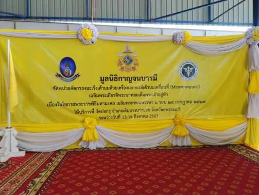 ในการนี้ มูลนิธิกาญจนบารมีร่วมกับคณะกรรมการประสานงานสาธารณสุขอำเภอเดิมบางนางบวช ได้นำสตรีอายุ 30-70 ปี เข้าร่วมกิจกรรมคัดกรองมะเร็งเต้านมโดยเครื่องเอกซเรย์เต้านมเคลื่อนที่ ในวันที่ 13-14 สิงหาคม 2567 ณ วัดบ่อกรุ ต.บ่อกรุ อ.เดิมบางนางบวช จ.สุพรรณบุรี