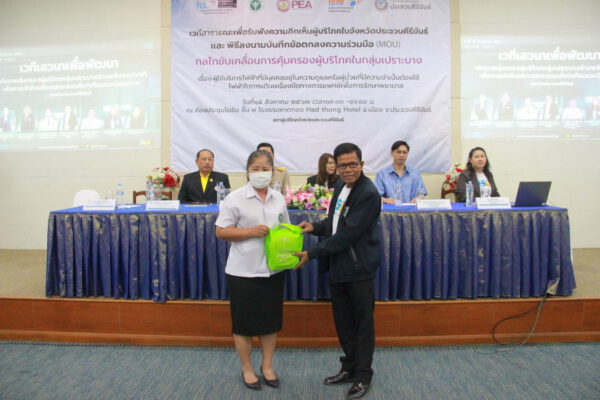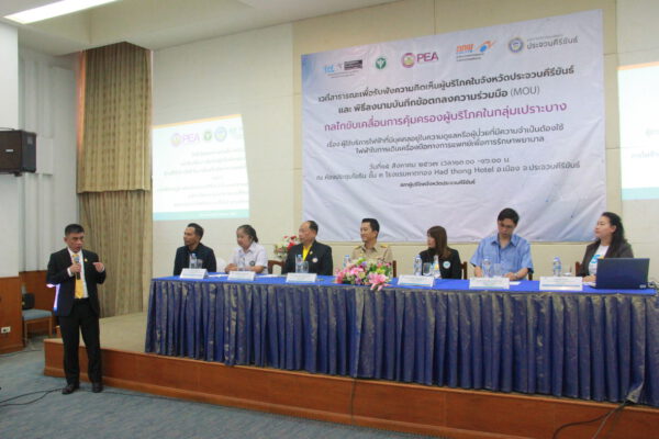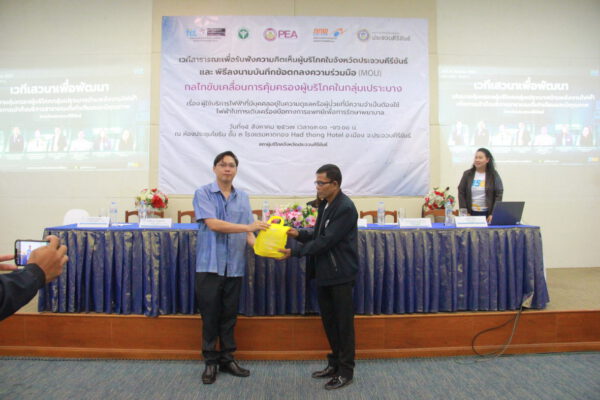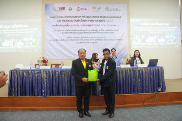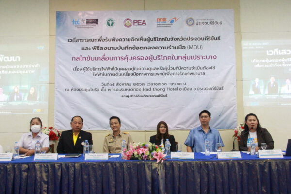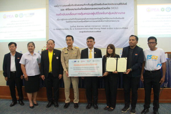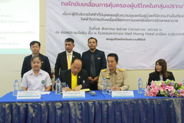 จากนั้น ได้จัดให้มีพิธีลงนามบันทึกข้อตกลงความร่วมมือ (MOU) กลไกขับเคลื่อนการคุ้มครองผู้บริโภคในกลุ่มเปราะบาง เรื่อง ผู้ใช้บริการไฟฟ้าที่มีบุคคลอยู่ในความดูแลหรือผู้ป่วยที่มีความจำเป็นต้องใช้ไฟฟ้าในการเดินเครื่องมือทางการแพทย์เพื่อการรักษาพยาบาล ระหว่าง นายวรวิทย์ ศรีอนันต์รักษา กกพ. นางจารุรัตน์ พัฒน์ทอง รองนายแพทย์สาธารณสุขจังหวัดประจวบฯ นายธีรภาพ เจริญสมบัติ ผู้จัดการการไฟฟ้าส่วนภูมิภาคจังหวัดประจวบฯ นายสราวุธ ลิ้มอรุณรักษ์ นายกองค์การบริหารส่วนจังหวัดฯ และ น.ส.ธนพร บางบัวงาม หัวหน้าหน่วยฯประจำจังหวัดประจวบฯ สภาองค์กรของผู้บริโภค โดยมี นายสุรัติ มัจฉา คพข.ประจำเขต 10 (ประจวบฯ) ร่วมเป็นพยาน