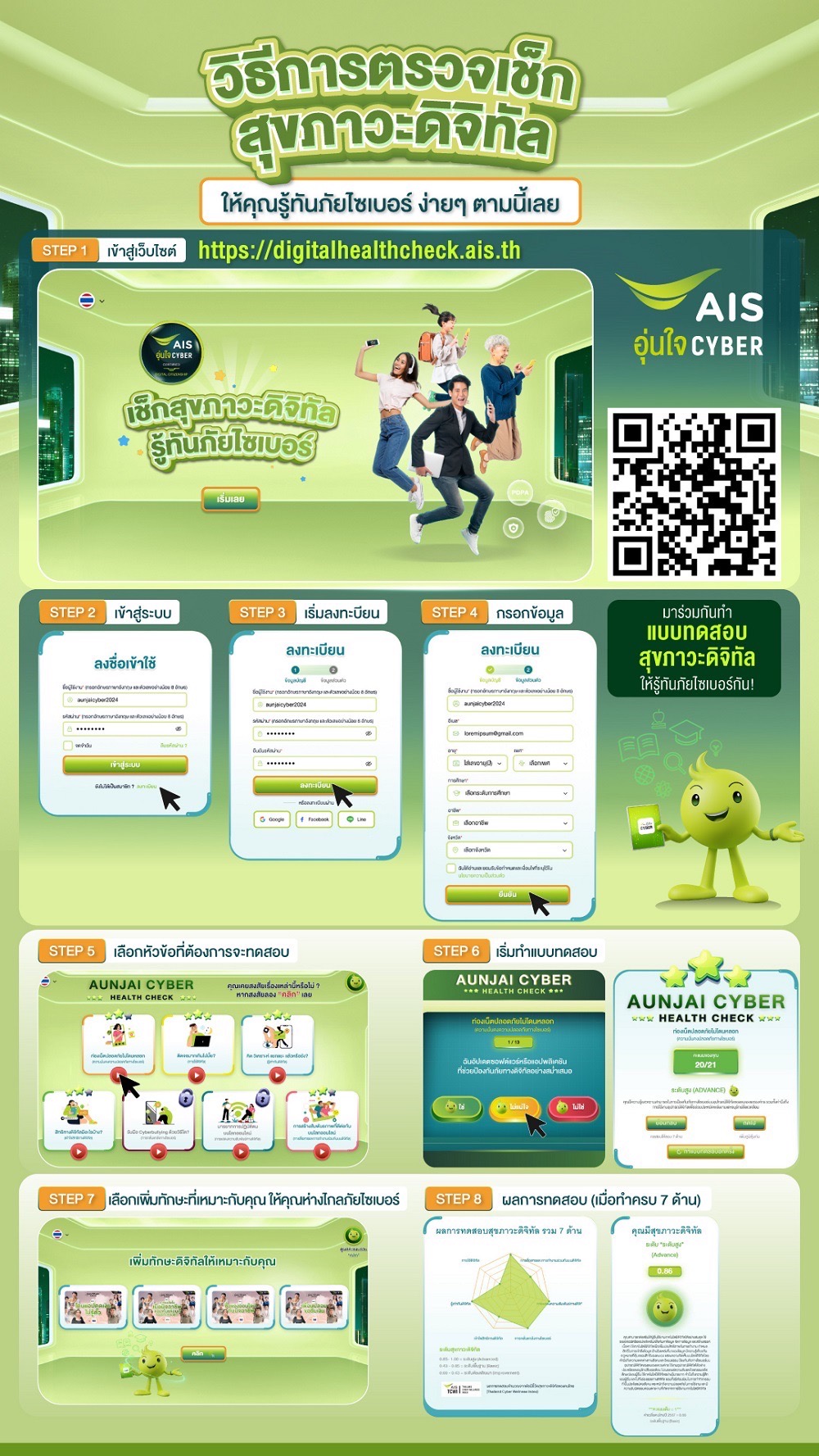 พร้อมกันนี้ได้พัฒนาเครื่องมือเช็กภูมิคุ้มกันภัยทางไซเบอร์แบบรายบุคคล หรือ Digital Health Check เป็นครั้งแรกในไทยที่ทุกคนสามารถประเมินระดับความสามารถในการรับมือจากภัยไซเบอร์พร้อมศึกษาความรู้จากหลักสูตรอุ่นใจไซเบอร์เพื่อยกระดับทักษะดิจิทัลได้ด้วยตัวเอง มากไปกว่านั้น AIS ยังได้นำเสนอเครื่องมือป้องกันภัยไซเบอร์ด้วยบริการ AIS Secure Net ที่วันนี้ได้เพิ่มการปกป้องที่ครอบคลุมมากขึ้น และเพิ่มประสิทธิภาพในการกรองเว็บไซต์อันตรายทั้งในและต่างประเทศ เพื่อให้ลูกค้า AIS ใช้งานอินเทอร์เน็ตได้อย่างอุ่นใจ ปลอดภัย ไร้กังวล และที่สำคัญลูกค้า AIS สามารถใช้บริการ AIS Secure Net ได้ฟรี เป็นระยะเวลา 12 เดือน
