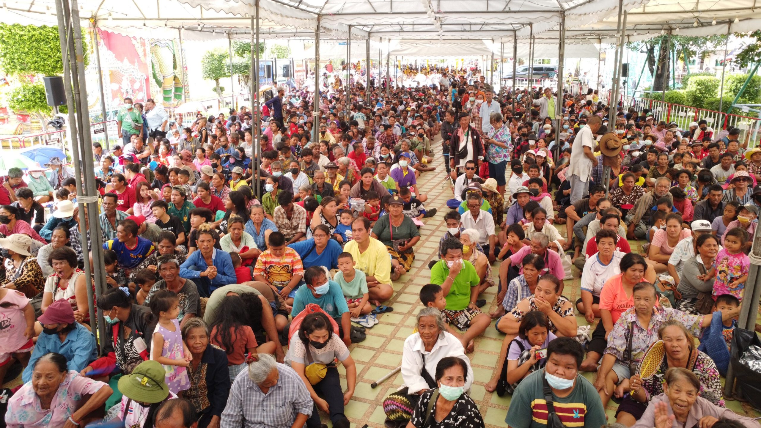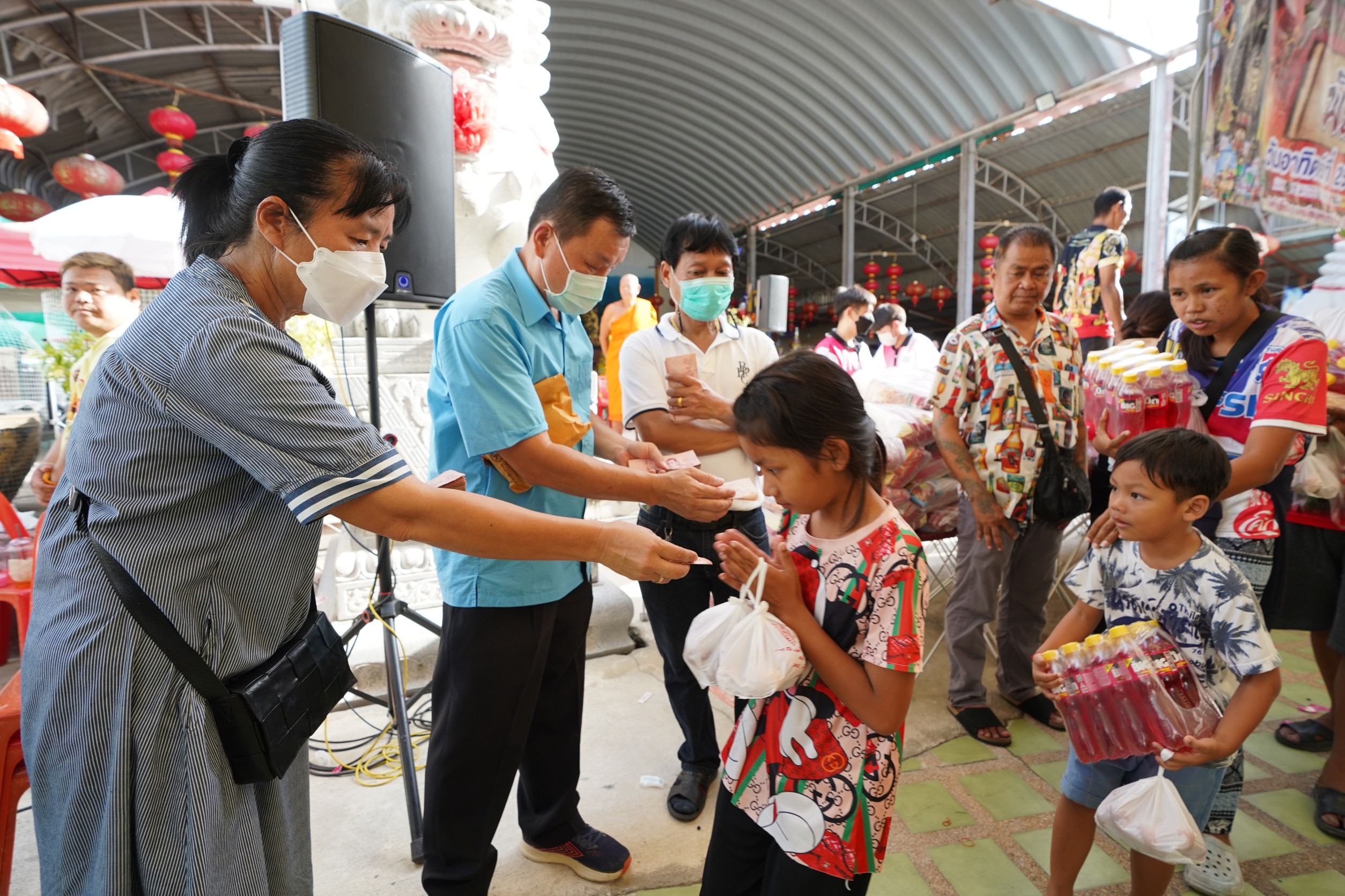 จากนั้นเวลา 15.00 น. เป็นการแจกทานให้กับผู้ยากไร้ ซึ่งในปีนี้มีประชาชนจากทั่วสารทิศ ทั้งในจังหวัดนครปมและจังหวัดใกล้เคียง เรือนหมื่นต่างได้ทยอยเข้ามาจับจองคิวในการรับแจกเครื่องใช้ในการยังชีพเป็นข้าวสาร อาหารแห้ง ซึ่งในปีนี้มีการแจกน้ำแดงอัดลมให้กับผู้มาร่วมงานคนละ 1 แพค เนื่องจากที่ผ่านมาไม่นานนี้ได้มีคนนำน้ำอัดลมมาถวายแก้บนให้กับกุมารสมบัตินับแสนขวด ทำให้คนที่มาร่วมงานต่างมีรอยยิ้มถ้วยหน้า นอกจากนี้คณะทัพบุญวัดไผ่ล้อมได้มีการ แจกเงินให้กับคนที่มารอรับของบริจาคทุกคน คนละ 100 บาท ยิ่งทำให้คนภายในงานทั้งเด็กและคนชราต่างๆ มีความสุขที่ได้รับทั้งของแจกและเงินสดกลับบ้านในปีนี้ด้วย