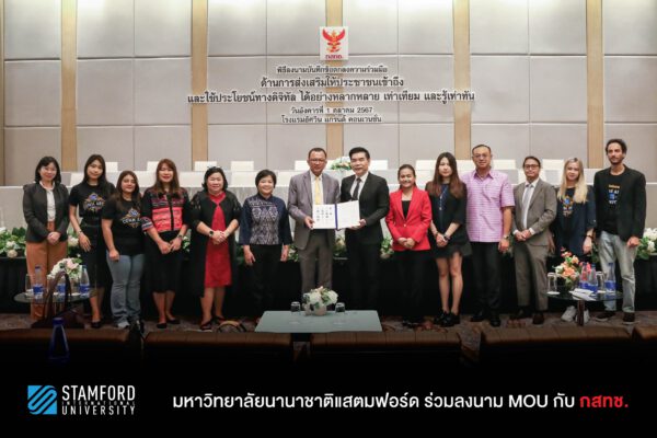 วันอังคารที่ 1 ตุลาคม 2567 ณ โรงแรมอัศวิน แกรนด์ คอนเวนชั่น กรุงเทพมหาวิทยาลัยนานาชาติแสตมฟอร์ด โดย ดร. อภิเทพ แซ่โค้ว (รักษาการอธิการบดี) พร้อมคณะผู้บริหารมหาวิทยาลัยฯ คณาจารย์ และนักศึกษาไทยและต่างชาติ เข้าร่วมในพิธีลงนามบันทึกข้อตกลงความร่วมมือกับ สำนักงานคณะกรรมการกิจการกระจายเสียง กิจการโทรทัศน์และกิจการโทรคมนาคมแห่งชาติ (กสทช.) สถาบันการศึกษาจากภาครัฐและภาคเอกชน และประชาสังคมต่างๆ รวม22 แห่ง
