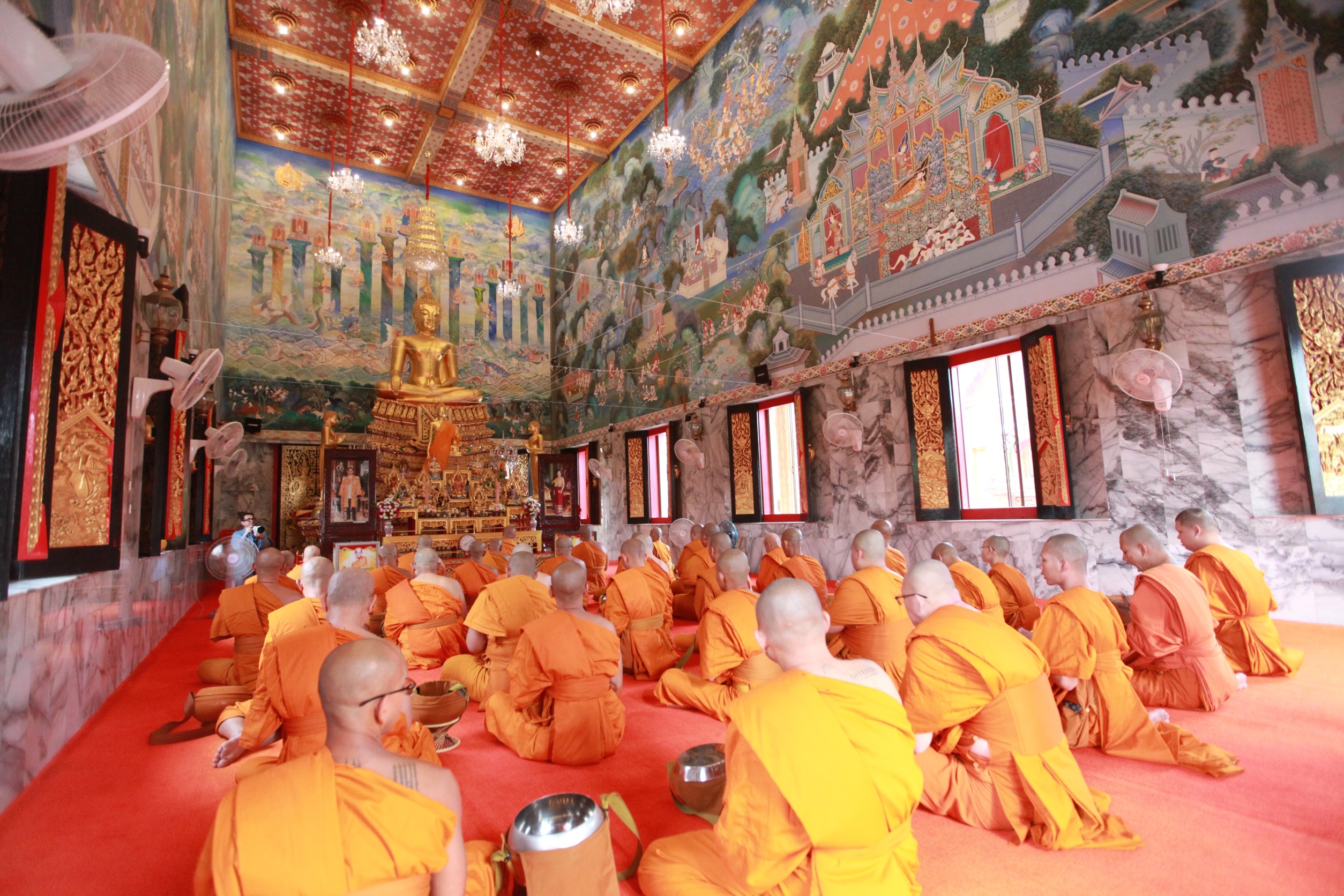โดยพิธีในช่วงเช้า พระครูปลัดสิทธิวัฒน์ นำคณะสงฆ์วัดไผ่ล้อมประกอบพิธีทางพระพุทธศาสนา เจริญพระพุทธมนต์ บทธัมมจักกัปปวัตตนสูตร และให้โอวาทแก่คณะสงฆ์และพุทธศาสนิกชนที่เข้ามาร่วมพิธี โดยให้ความหมายของการสวดเจริญพระพุทธมนต์บทดังกล่าว เพื่อเป็นพุทธบูชา ธรรมบูชา และสังฆบูชา ถวายแด่องค์สมเด็จพระสัมมาสัมพุทธเจ้า และองค์เทพเทวดา เพื่อให้มาร่วมอนุโมทนา และให้พุทธศาสนิกชนได้ร่วมสืบสานประเพณีอันดีงาม จากนั้นได้นำคณะสงฆ์ออกบิณฑบาต ท่ามกลางญาติโยมที่เข้ามาร่วมกันใส่บาตรอย่างเนืองแน่นในวันนี้