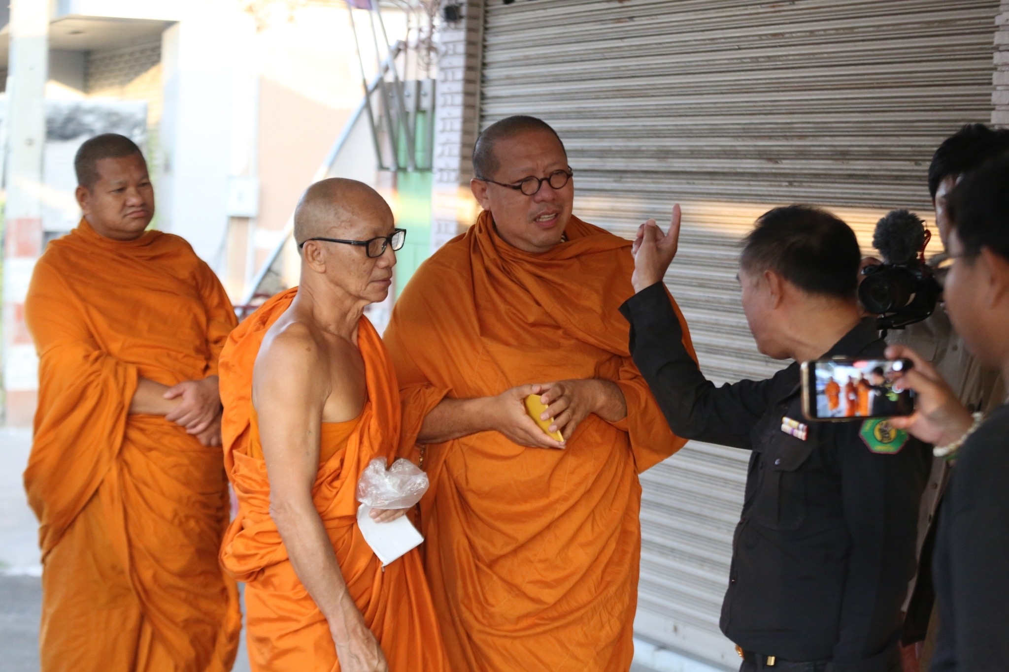 ซึ่งเมื่อพระเรืองชัย ทราบว่ามีเจ้าหน้าที่เทศกิจฯ ได้มีการขับไล่และแจ้งว่าไม่สามารถจะมาเดินบิณฑบาตในบริเวณดังกล่าวได้จึงรีบเดินกลับมาที่รถและมาพบชุดติดตามจึงเกิดความตกใจและรีบขับรถยนต์กระบะออกไปจากสถานีตำรวจภูธรบ้านโป่ง แต่ไปไม่รอดและถูกเจ้าหน้าที่ขวางสกัดจับได้หลังหลังจากขับออกไปได้เพียง 1 กิโลเมตร โดยขณะที่ทำการจับกุมพระเรืองชัย มีสีหน้าซีด นิ่งเงียบ และพูดบอกเพียงว่าจะไปปฏิบัติธรรมบ้าง เพิ่มมามาหาญาติที่นี่บ้าง แต่หลวงพี่น้ำฝน ซึ่งนั่งรถที่ขับตามประกบอยู่ได้ลงมาแจ้งว่าได้ติดตามตัวมาตั้งแต่หน้าบ้านที่จังหวัดนครปฐมแล้ว จึงยอมจำนนด้วยหลักฐานและสารภาพว่าขับรถมาจริง แต่ครั้งนี้ได้มีการบวชพระอย่างถูกต้องมาแล้ว