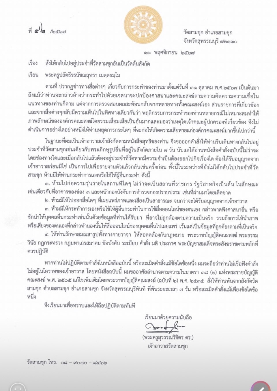 วันที่ 13 พฤศจิกายน 67 จากกรณี พระครูปลัดธีรธนัชณฤทธา เมตตฺตธมฺโม (เสาวภาคย์โชติรส) หรือที่รู้จักกันในชื่อ “พระครูปลัดธีระ” หรือ “พระปีนเสา” สังกัดวัดสามชุก จ.สุพรรณบุรี ได้มีประเด็นถูกสังคมวิพากษ์วิจารณ์ถึงความไม่เหมาะสมในหลายกรณี ก่อนที่เจ้าอาวาสวัดสามชุก จังหวัดสุพรรณบุรี ได้มีหนังสือเรียกตัวกลับวัดภายใน 7 วัน หลังจากที่พระครูปลัดสิทธิวัฒน์ หลวงพี่น้ำฝน เจ้าอาวาสวัดไผ่ล้อม ประสานสนธิกำลังเจ้าหน้าที่จากสำนักงานพระพุทธศาสนาจังหวัดนครปฐม เจ้าหน้าที่สำนักงานพระพุทธศาสนาจังหวัดนครปฐม เจ้าหน้าที่ฝ่ายปกครองอำเภอนครชัยศรี เข้าตรวจค้น สำนักปฏิบัติธรรมพุทธะชยันตรีในพื้นที่ ตำบลห้วยพลู อำเภอนครชัยศรี จังหวัดนครปฐม