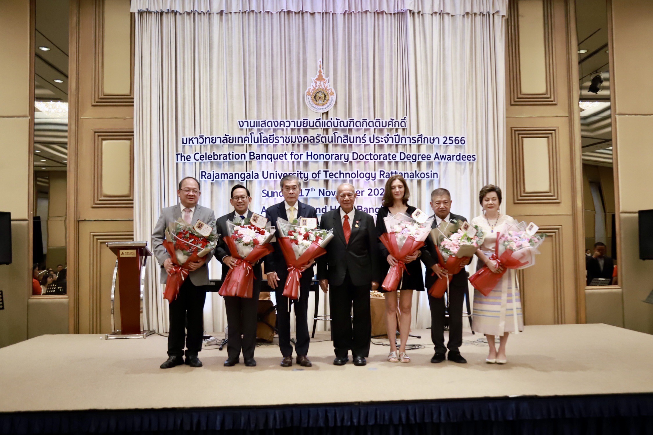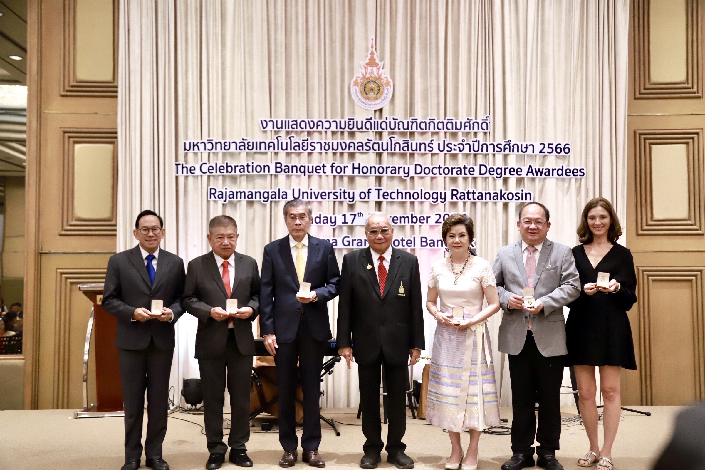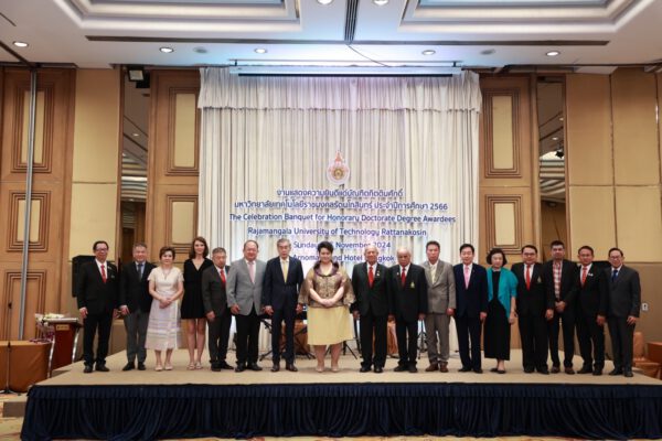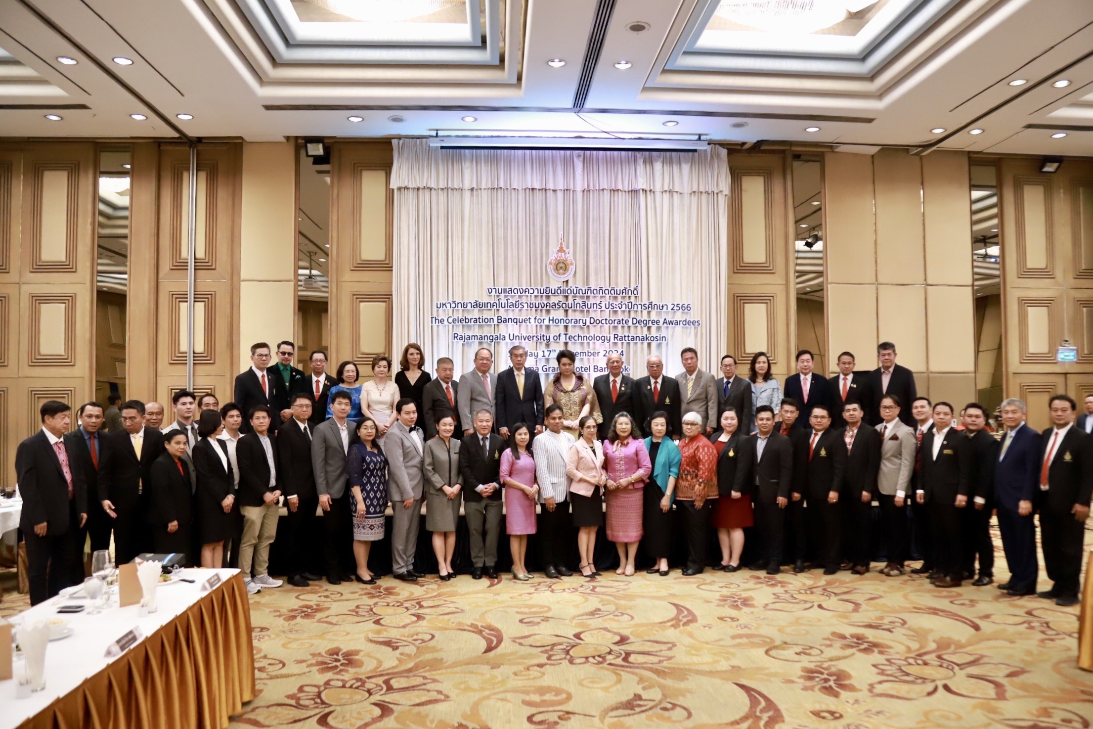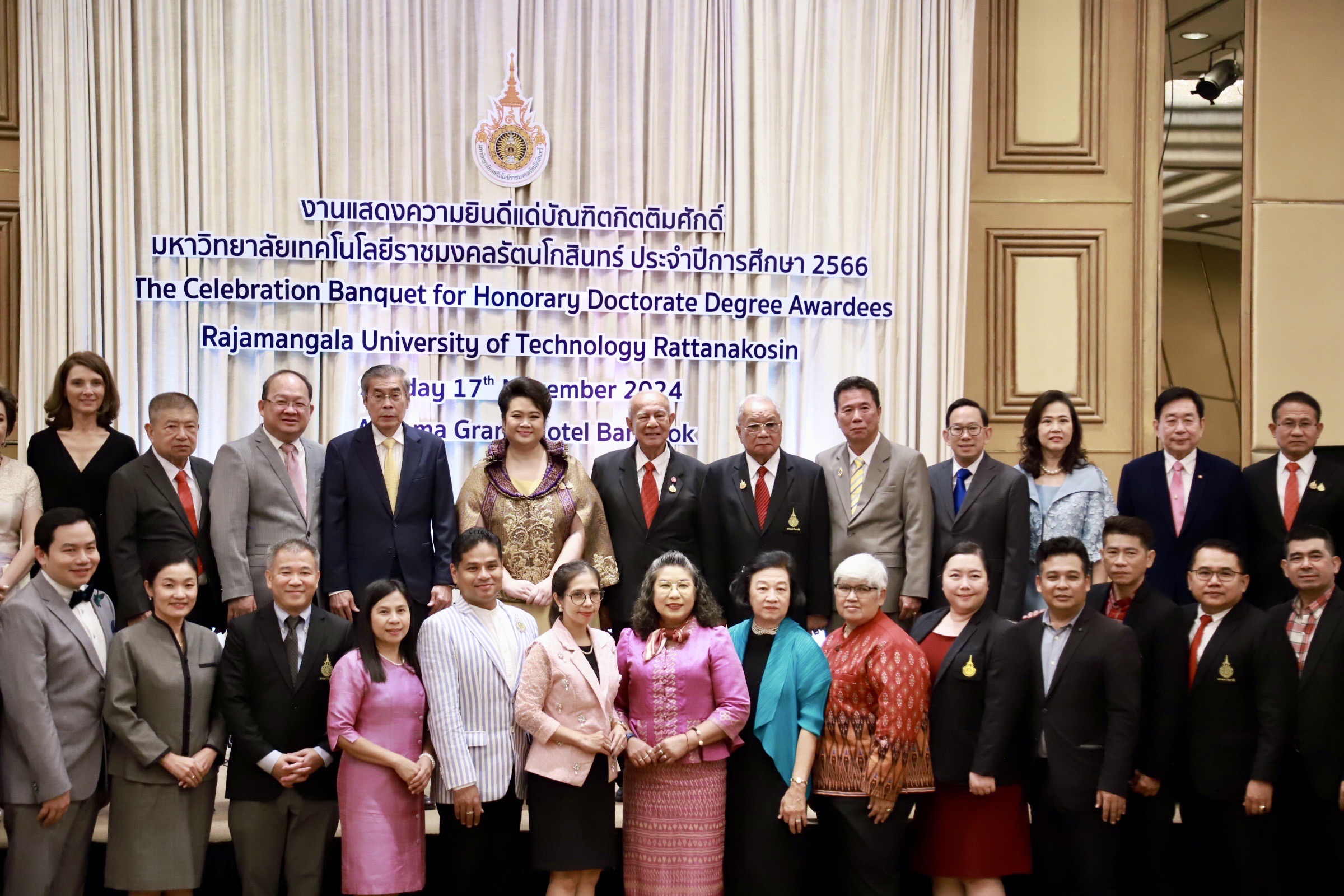 วันอาทิตย์ที่ 17 พฤศจิกายน 2567 มทร.รัตนโกสินทร์ นำโดย พลเอก จรัล กุลละวณิชย์ นายกสภามหาวิทยาลัย พร้อมด้วย รศ.ดร.อุดมวิทย์ ไชยสกุลเกียรติ อธิการบดี และคณะผู้บริหาร จัดงานเลี้ยงฉลองบัณฑิตกิตติมศักดิ์ มทร.รัตนโกสินทร์ ปีการศึกษา 2566 แสดงความยินดี และร่วมมอบของที่ระลึกแด่บัณฑิตกิตติมศักดิ์ ทั้งนี้มีดร.ปราจิน เอี่ยมลำเนา นายกสมาคมศิษย์เก่าฯ และดร.สมศักดิ์ วาทินชัย ประธานชมรมบัณฑิตกิตติมศักดิ์ ร่วมแสดงความยินดีในครั้งนี้ด้วย ท่ามกลางบรรยากาศที่อบอุ่น ณ ห้องแกรนด์ อโนมา โรงแรมอโนมาแกรนด์ กรุงเทพฯ