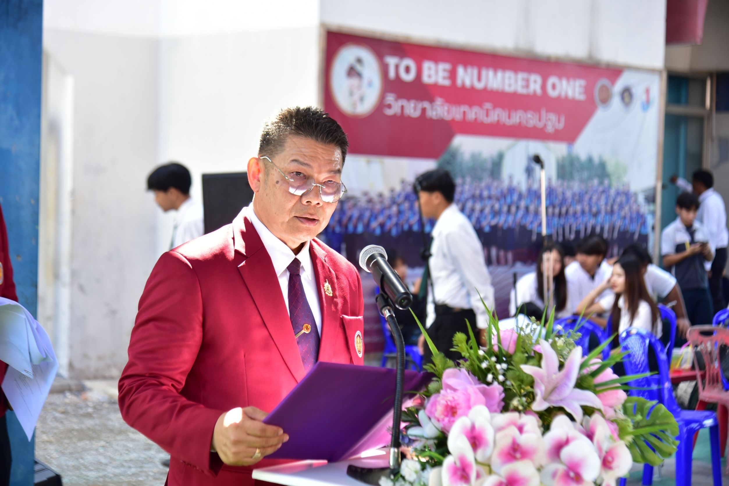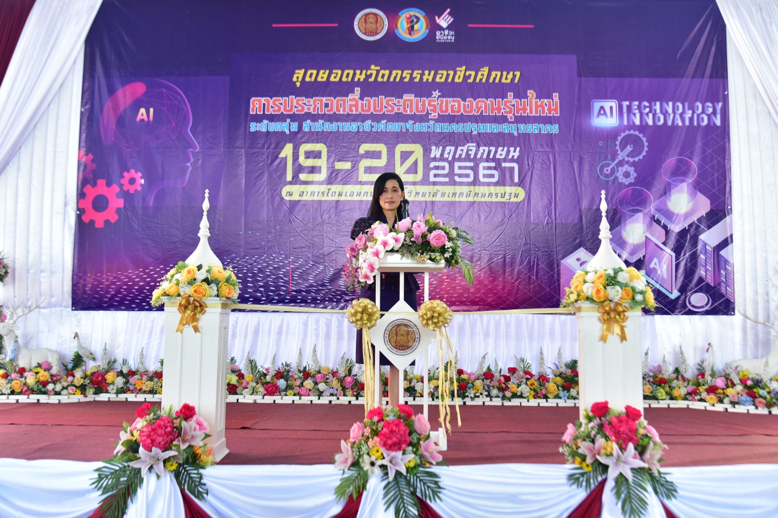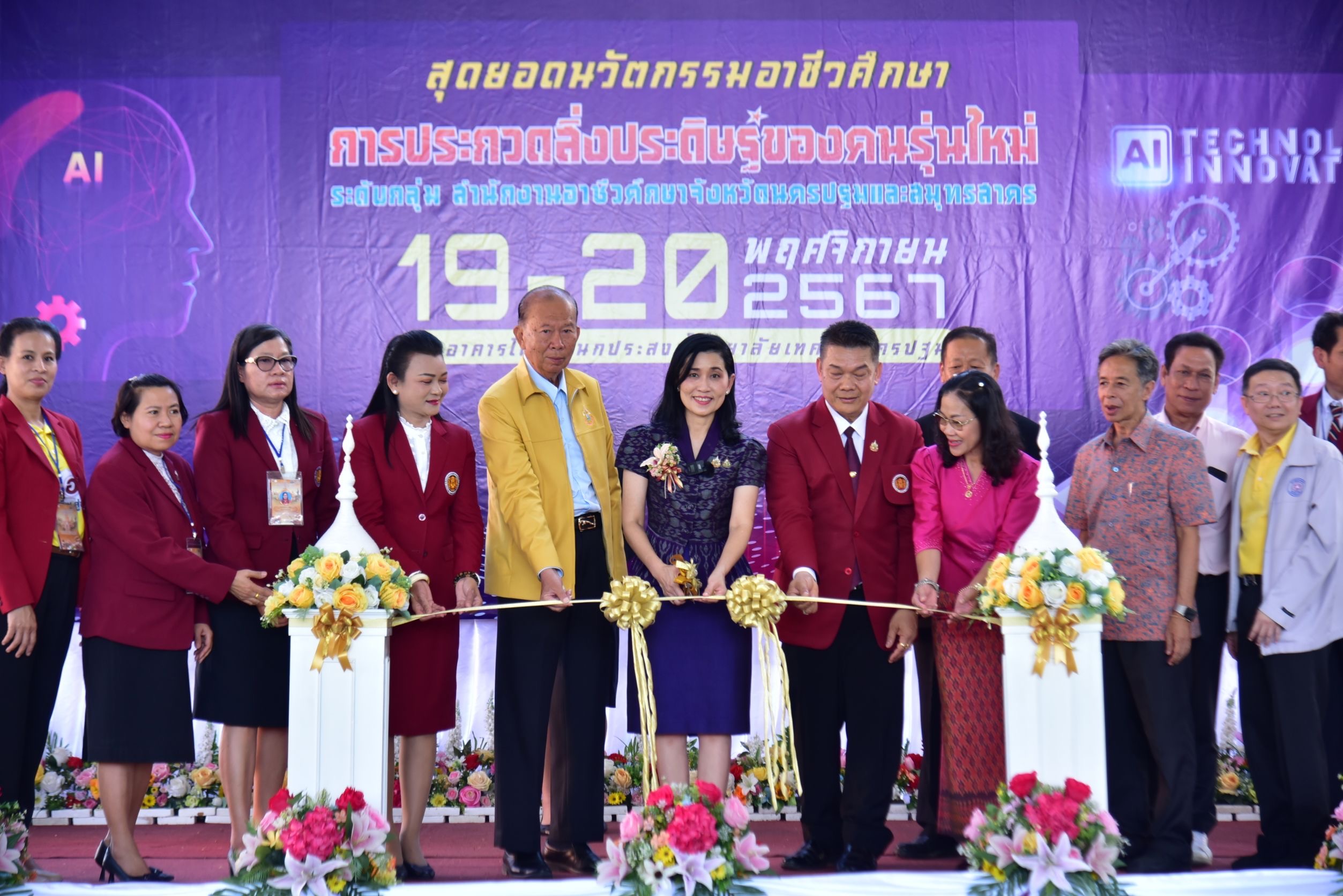 วันที่ 19 พฤศจิกายน 2567 เวลา 10.00 น. ที่อาคารอเนกประสงค์ วิทยาลัยเทคนิคนครปฐม นางสาวอโรชา นันทมนตรี รองผู้ว่าราชการจังหวัด รักษาราชการแทนผู้ว่าราชการจังหวัดนครปฐม เป็นประธานเปิดการประกวดสิ่งประดิษฐ์ของคนรุ่นใหม่ ประจำปีการศึกษา 2568 “สุดยอดนวัตกรรม อาชีวศึกษา” ระดับกลุ่ม สำนักงานอาชีวศึกษาจังหวัดนครปฐม และสมุทรสาคร โดยว่าที่ร้อยตรี ดร.ชนะคมศร คงยืน ผู้อำนวยการวิทยาลัยเทคนิคนครปฐม ปฏิบัติหน้าที่ผู้อำนวยการสำนักงานอาชีวชีวศึกษาจังหวัดนครปฐม กล่าวว่า ตามที่สำนักงานคณะกรรมการการอาชีวศึกษา มีนโยบายในด้านพัฒนาคุณภาพการเรียนการสอนผู้เรียนอาชีวศึกษา เป็นการยกระดับคุณภาพอาชีวศึกษา โดยการส่งเสริมและสนับสนุนการวิจัยพัฒนานวัตกรรมและสิ่งประดิษฐ์อาชีวศึกษาทุกระดับของสถานศึกษาในสังกัด เพื่อเพิ่มสมรรถนะผู้เรียนสู่กำลังคนสมรรถนะสูง สร้างทักษะการเรียนรู้และนวัตกรรม ทักษะที่จำเป็นในศตวรรษที่ 21 ด้วยการสร้างผลงาน สร้างสรรค์งานวิจัยและนวัตกรรมอาชีวศึกษา ที่เกิดจากการบูรณาความรู้และทักษะในสาชาวิชาชีพ จาการเรียนรู้คิด วิเคราะห์ สร้างสรรค์ พัฒนาผลงานนวัตกรรมสิ่งประดิษฐ์ ให้มีมาตรฐานเทียบได้กับระดับสากล และบูรณาการนวัตกรรมสิ่งประดิษฐ์ และองค์ความรู้อาชีวศึกษาสู่ชุมชน สังคม ประเทศชาติ และนานาชาติ รวมทั้งส่งเสริมให้มีเวทีแลกเปลี่ยนเรียนรู้ภายได้กิจกรรมการประกวดสิ่งประดิษฐ์ของคนรุ่นใหม่ (OVEC Show & & Share)