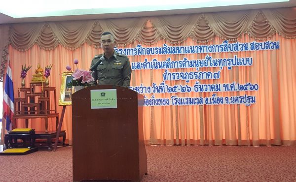 เมื่อเวลา 09.00 น.วันที่ 25 ธันวาคม 2560 ที่ผ่านมาที่ห้องกิ่งทองโรงแรมเวล อำเภอเมืองจังหวัดนครปฐม พลตำรวจตรีสมประสงค์ เย็นท้วม รองผู้บัญชาการตำรวจภูธรภาค 7 ได้เป็นประธานในพิธีเปิดการฝึกอบรมสัมมนาแนวทางการสืบสวนสอบสวนและดำเนินคดีการค้ามนุษย์ในทุกรูปแบบของตำรวจภูธรภาค 7 โดยมี พลตำรวจตรี สุพัฒน์ เชยชิด ผู้บังคับการ อำนวยการตำรวจภูธรภาค 7 พันตำรวจเอกวิเชียร อินเทียน รองผู้บังคับการ อำนวยการตำรวจภูธรภาค 7 และ ผู้บังคับบัญชาส่วนงานอำนวยการตำรวจภูธรภาค 7 ร่วมในพี มี ผู้เข้าร่วมรับการฝึกอบรม ประกอบด้วยข้าราชการตำรวจในสังกัดตำรวจภูธรภาค 7 ชั้นสัญญาบัตรระดับรองสารวัตรขึ้นไปถึงรองผู้กำกับการสายงานป้องกันและปราบปราม และพนักงานสอบสวนที่ปฏิบัติหน้าที่เกี่ยวกับการค้ามนุษย์จำนวน 80 นาย ระยะเวลาการรมสัมมนา 2 วันคือวันที่ 25-26 ธันวาคม 2560 โดยได้รับเกียรติจากนายตำรวจผู้เชี่ยวชาญด้านการสอบสวน และปฏิบัติการตรงด้านการสืบสวนเหยื่อค้ามนุษย์มาเป็นวิทยากรให้ความรู้แก่ผู้เข้ารับการอบรม